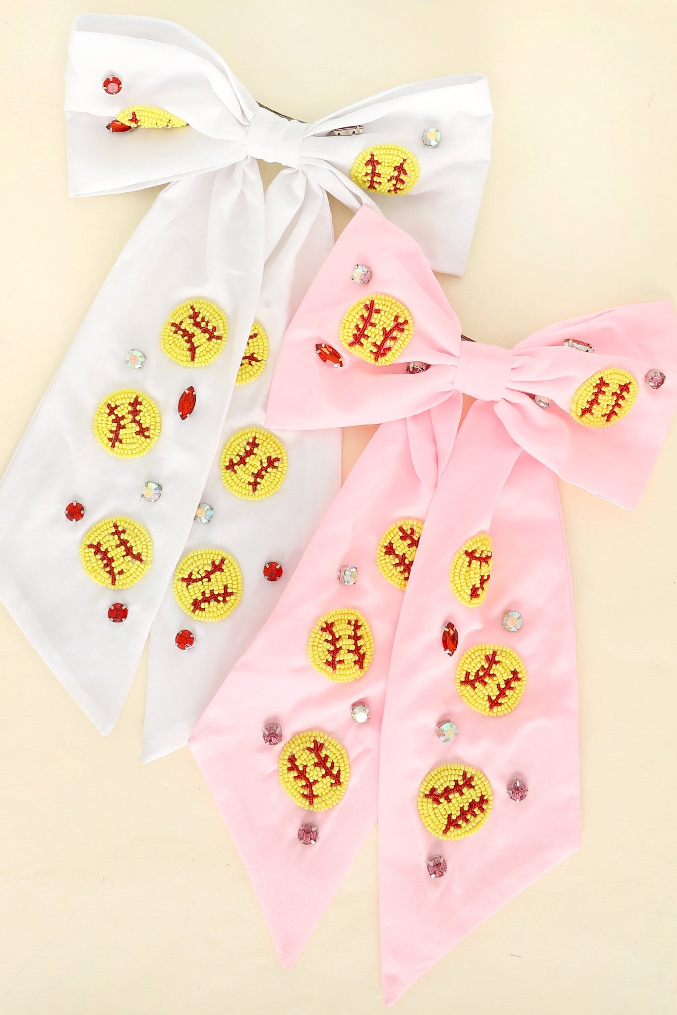 SOFTBALL BEAD GEMSTONE EMBROIDERED BOW BARRETTE HAIR CLIP - WHITE