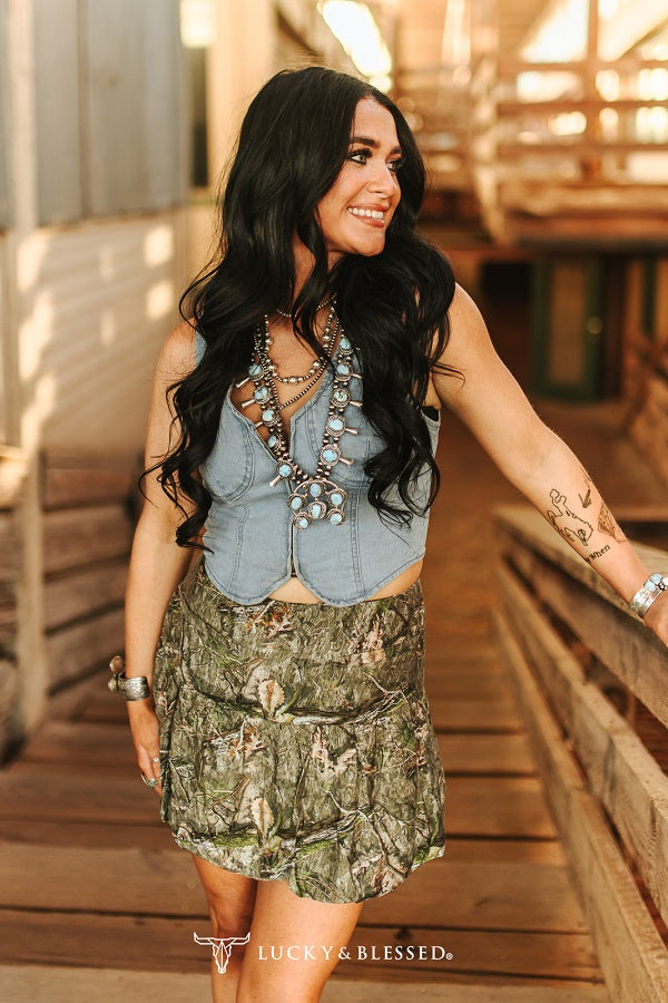 Bring a rugged yet feminine edge to your boutique collection with this Camo Ruffle Bubble Mini Skirt with short lining by Lucky & Blessed. Designed with soft, lightweight fabric that moves beautifully, this Western-inspired skort features a tiered ruffle silhouette and a flattering high-waisted fit. The camouflage pattern gives it a rustic ranch vibe, perfect for pairing with denim corset tops, graphic tees, or concho belts. Whether styled for rodeo season or everyday cowgirl wear, this skort captures the perfect balance of wild outdoor charm.