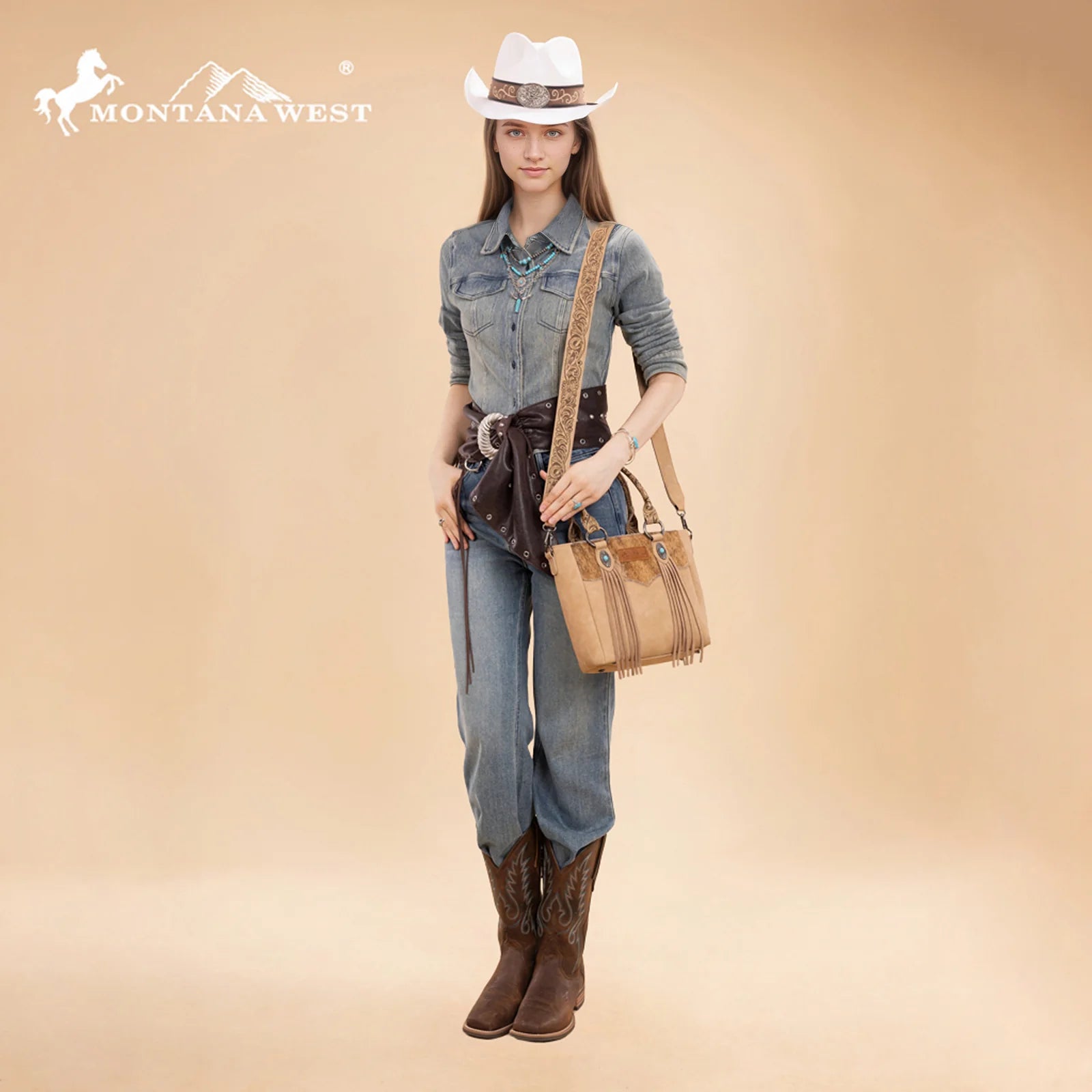 • Detachable floral tooled crossbody included (46")