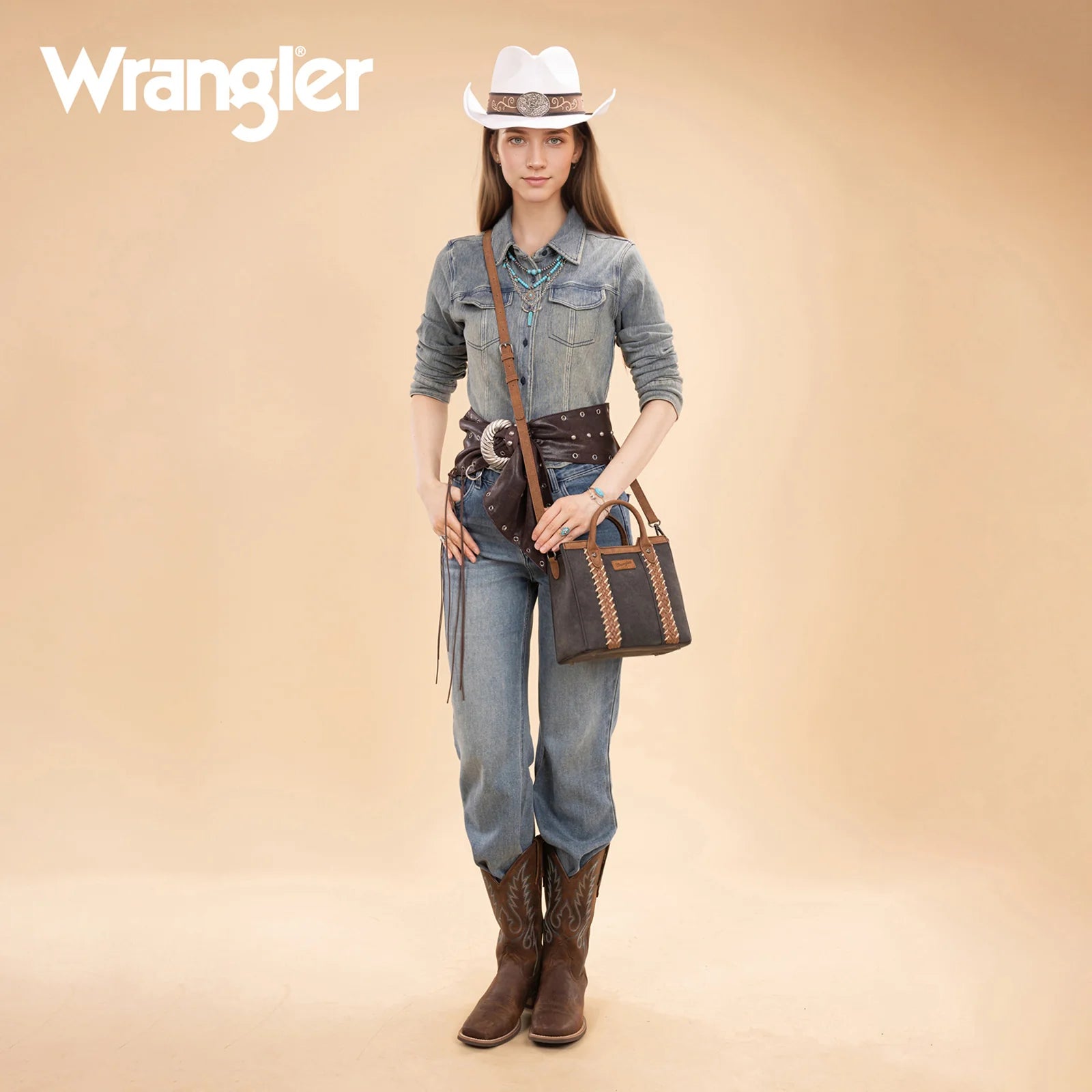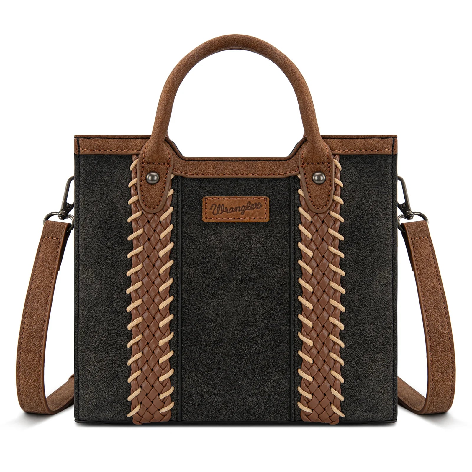 Timeless western charm with everyday versatility. This Wrangler top handle crossbody features eye-catching braided panels with whipstitch accents that add texture and rustic appeal.