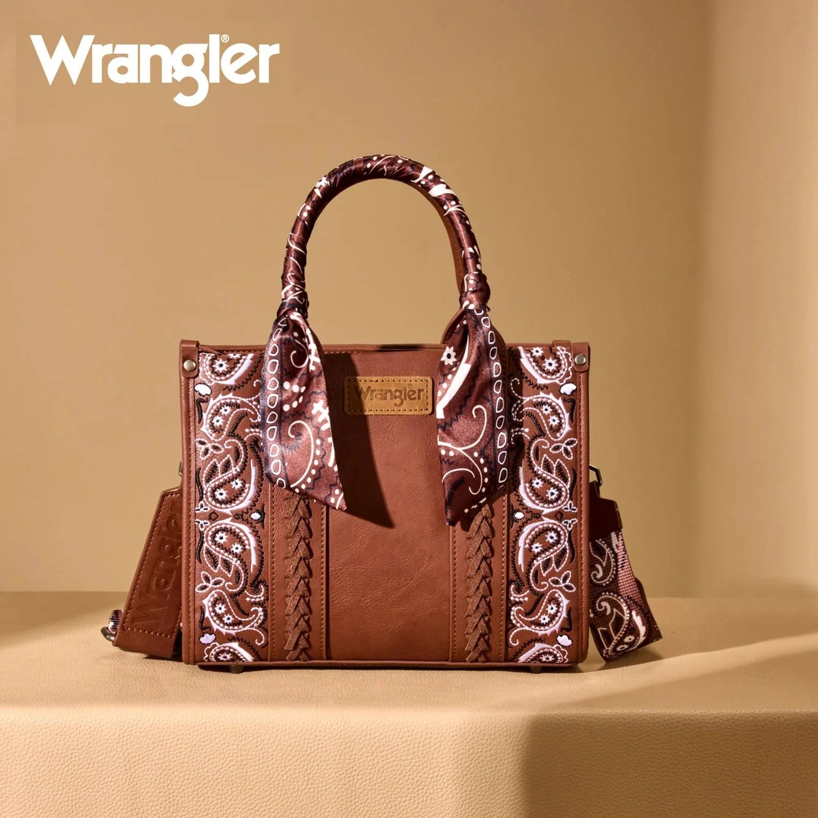 Crafted from durable PU leather, this bandana hand-tie handle tote combines western charm with everyday functionality. Featuring an embroidered paisley accented with whipstitch details, it’s finished with a Wrangler® logo applique on the front for a signature touch.