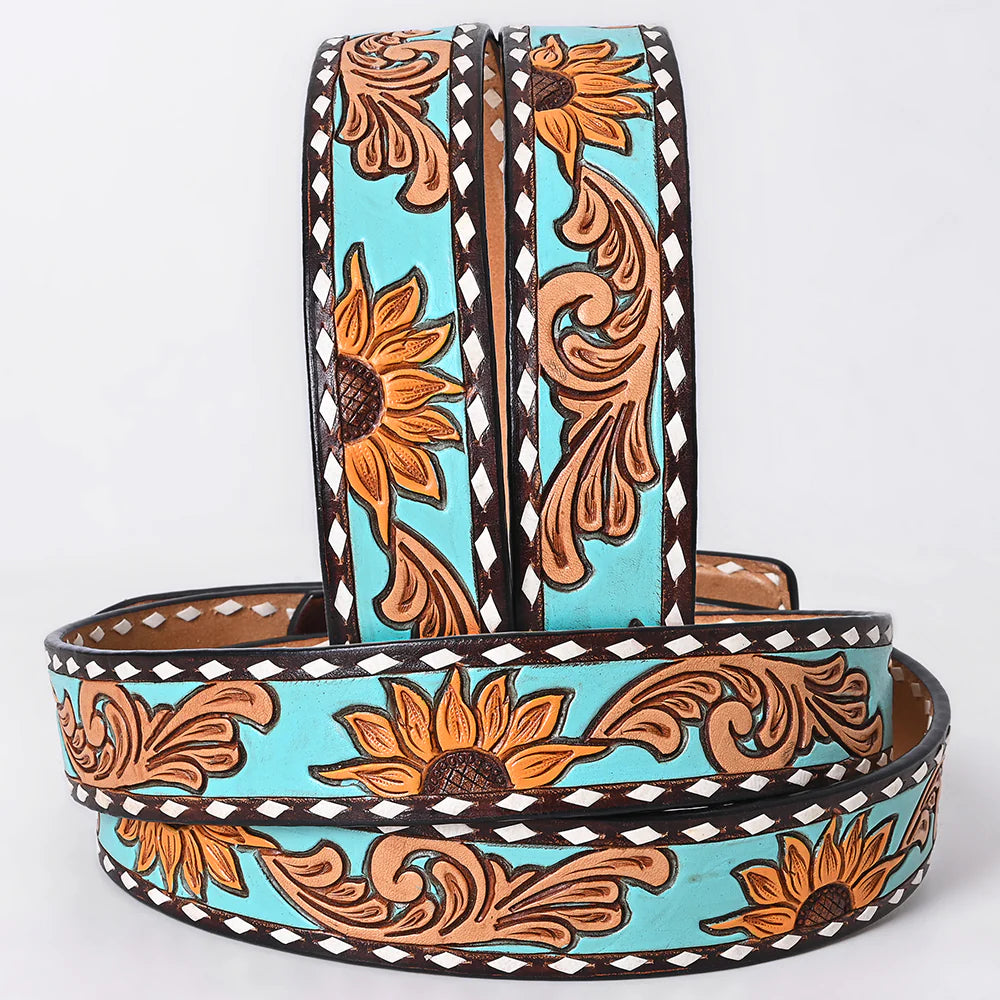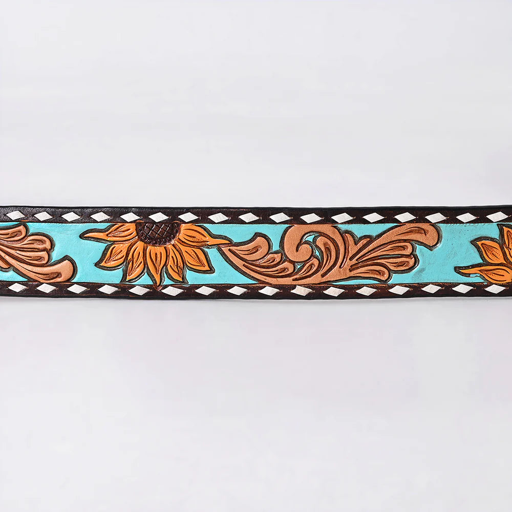 Brighten your Western wardrobe with this striking hand-tooled leather belt, featuring bold sunflower carvings against a vibrant turquoise backdrop. Crafted from premium full-grain leather, this belt celebrates Southwest charm with rich floral scrollwork and crisp white diamond-edge lacing. The matching tooled buckle completes this eye-catching design- perfect for rodeos, festivals, and everyday flair.