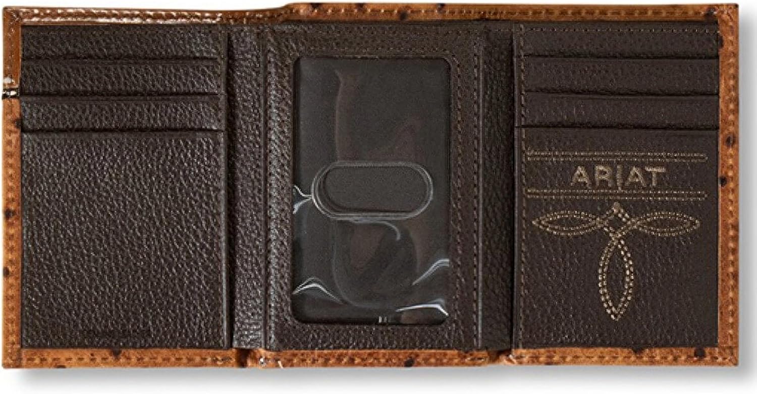Ariat trifold wallet by M&F Western Products. This great wallet is made of genuine leather with an ostrich pattern and heavy duty stitching. Accented with a tan tab with floral embossing. Slim fit design. Credit card slots and one clear ID pocket for plenty of storage.