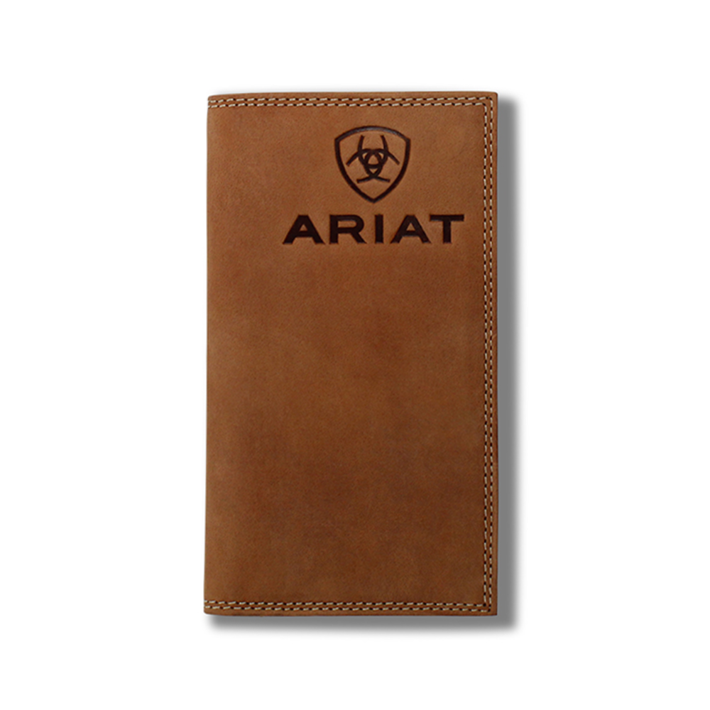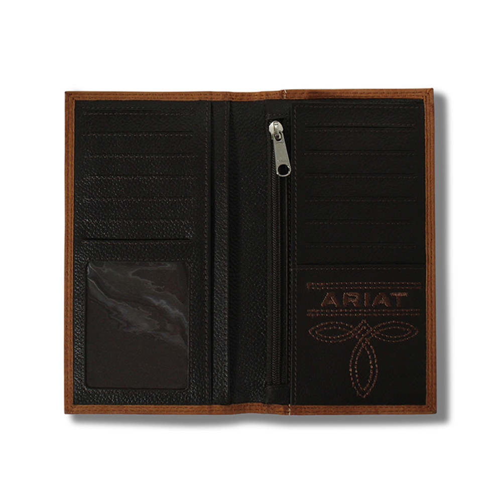 Stay organized with this rodeo style Ariat wallet by M&F Western Products. Genuine leather with contrast double stitching and embossed Ariat logo and shield at the top of the wallet. Features multiple compartments for your credit cards, cash and ID.