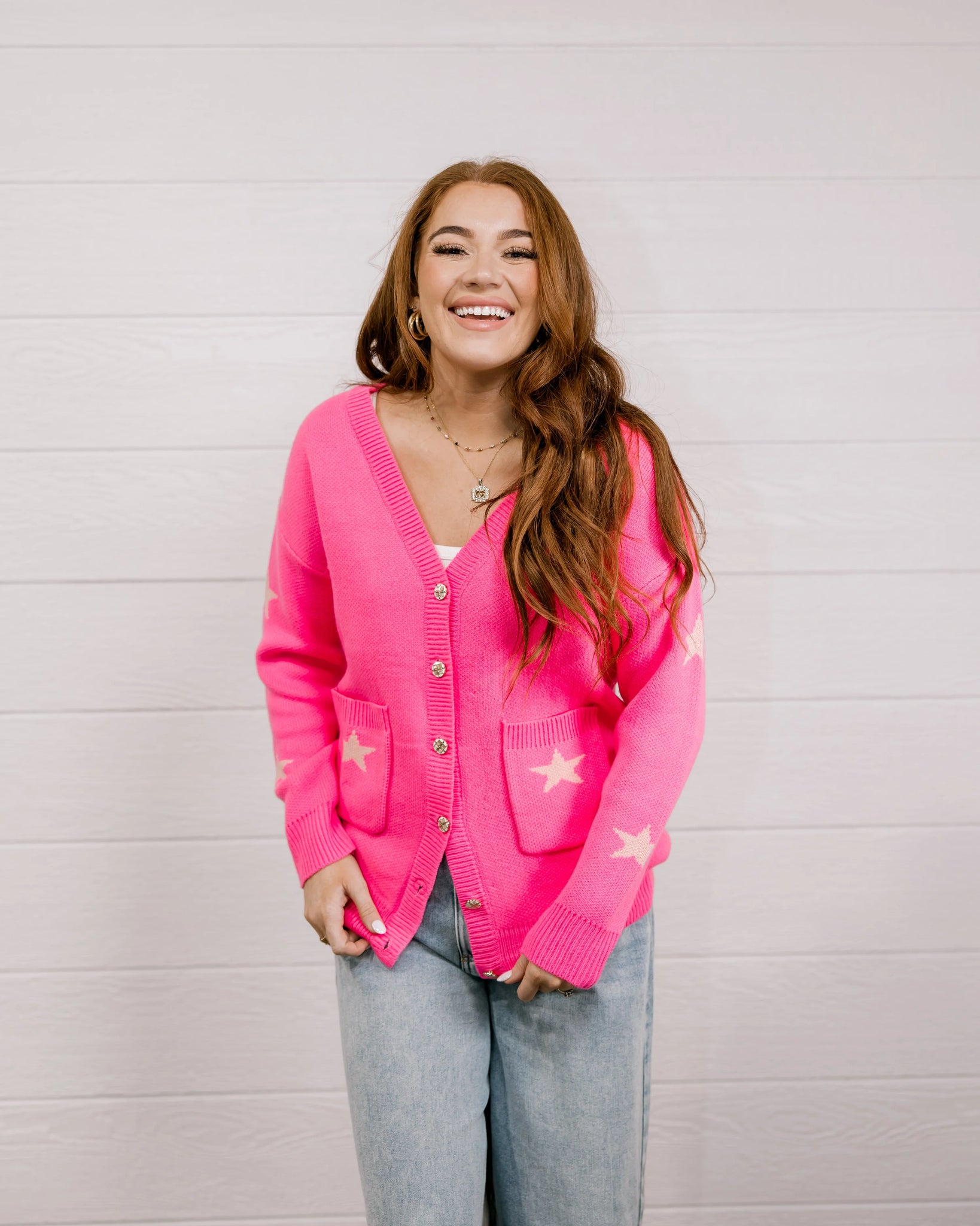 This hot pink cardigan brings bold cowgirl energy with a buckin’ horse graphic that steals the show from the back. Soft, cozy, and full of personality, it’s the perfect mix of sweet and western sass. Style it buttoned up with high-rise denim or layer it over a tee with boots for a playful rodeo-ready look.