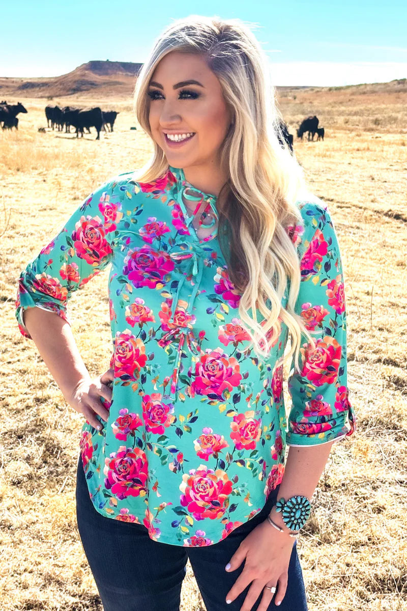 Elevate your wardrobe with this stunning turquoise top, adorned with a delicate rose pattern that brings timeless elegance to any outfit. The soft, flowing fabric drapes beautifully while the charming floral design adds a romantic touch. Perfect for casual days or dressed-up occasions, this versatile piece pairs effortlessly with your favorite bottoms. A wardrobe essential that combines comfort with sophisticated style.