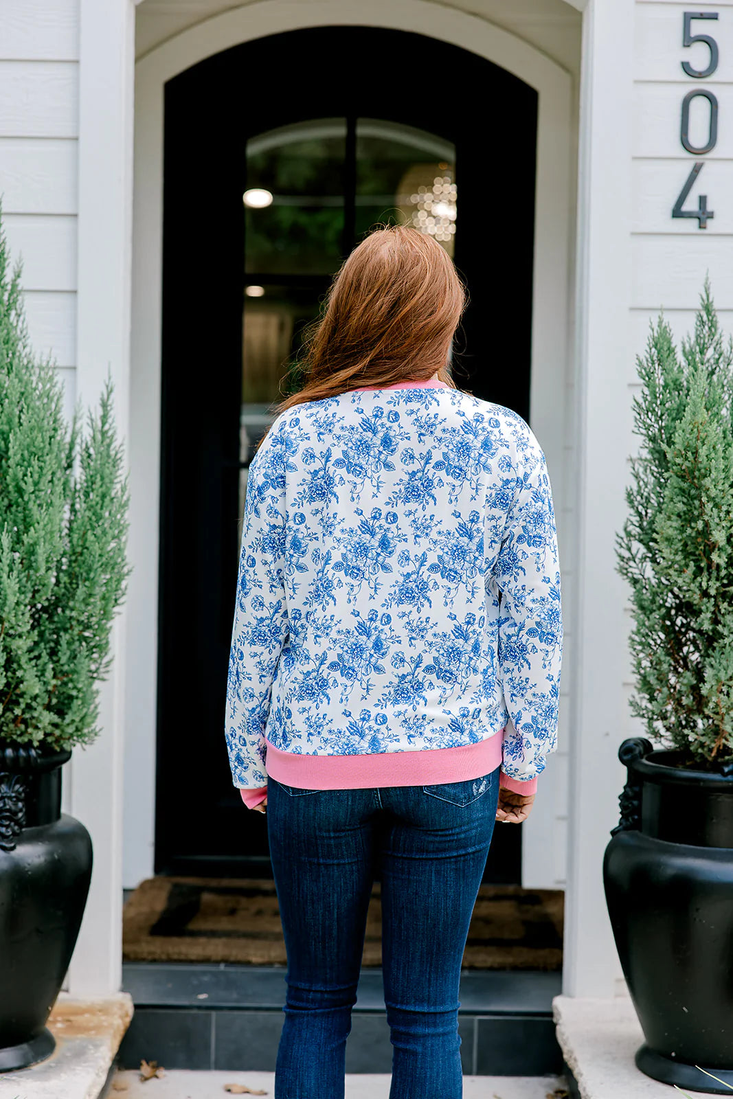 Soft, cheerful, and full of holiday charm, it's perfect for celebrating in comfort and style. Stay cozy and festive in this blue floral sweatshirt with pink accents and a pink sparkle "Merry Christmas" design.