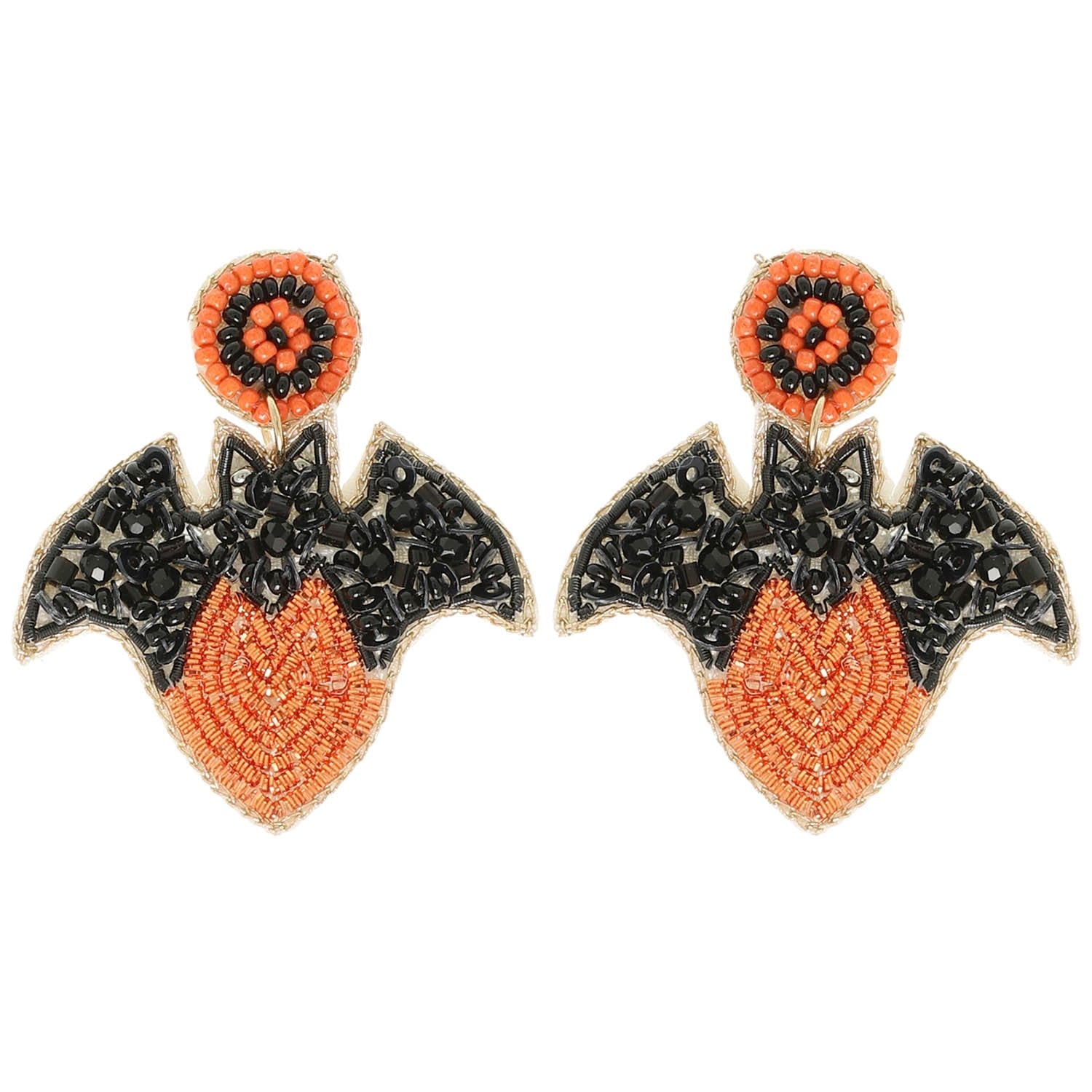 HALLOWEEN BAT ON HEART CRYSTAL SEED BEADED POST DANGLE EARRINGS HEIGHT: 2" WIDTH: 1.75"