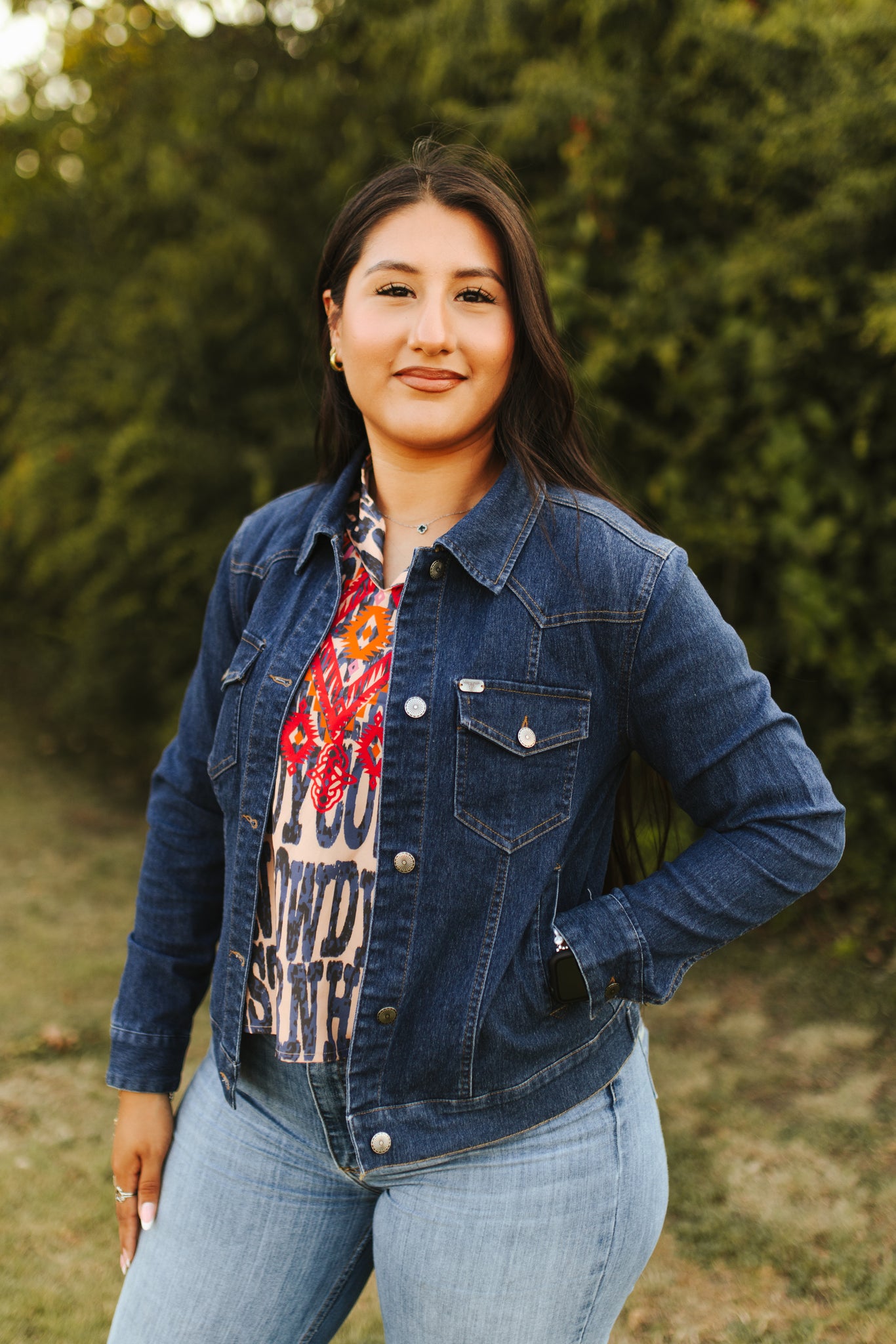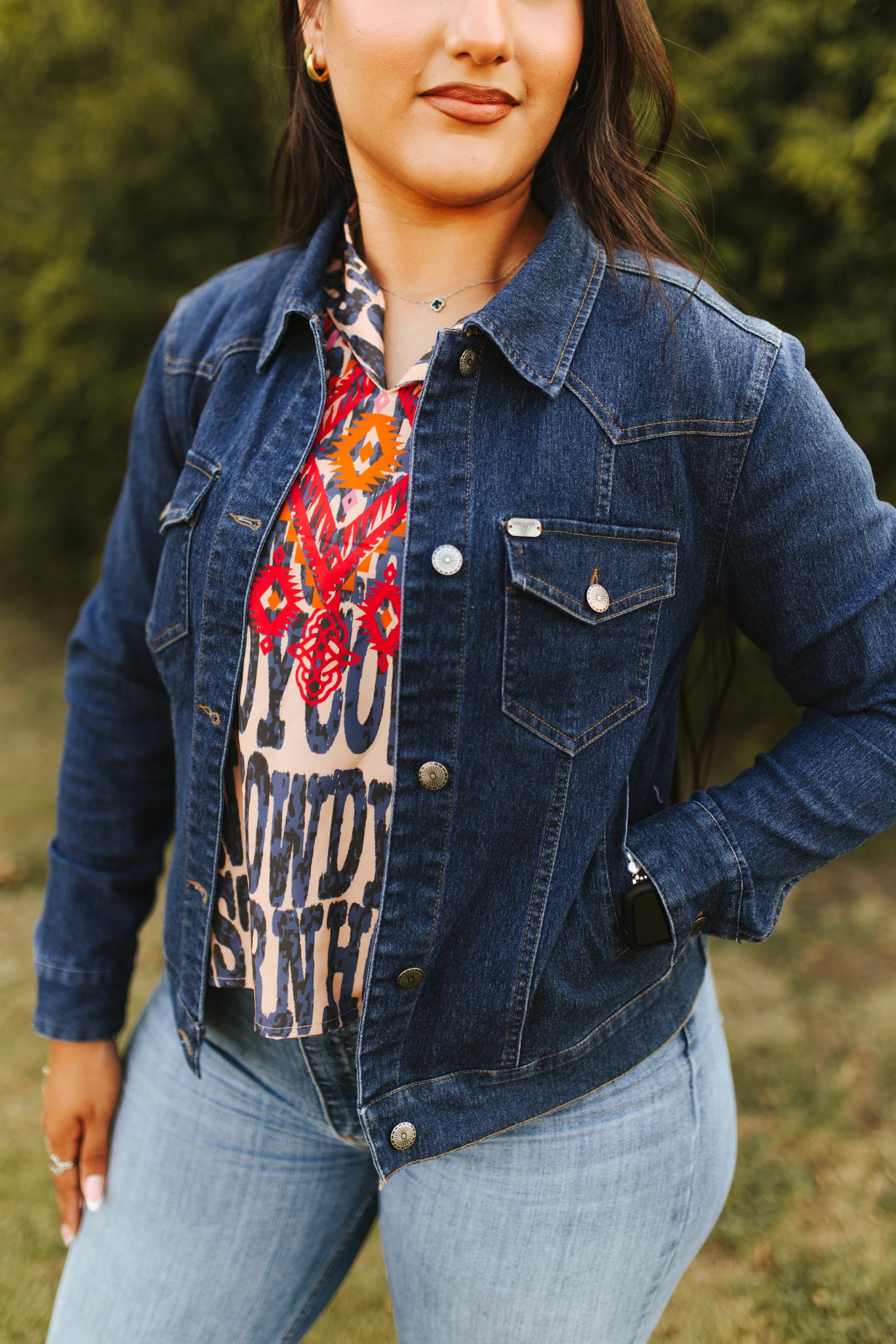 Add timeless Western charm to your boutique with this Lucky & Blessed dark wash denim jacket — a true staple for the modern cowgirl. Crafted with a structured yet stretchy silhouette, this classic snap-button jacket features front flap pockets, curved seams for a flattering fit, and bold bronze hardware for a rugged finish. The dark wash hue offers versatility and sophistication, pairing effortlessly with anything from graphic tees to rodeo-ready dresses. Whether styled for an everyday ranch look or layered over fringe tops for cooler rodeo nights, this denim jacket is a must-have layering piece for the Western-chic wardrobe.