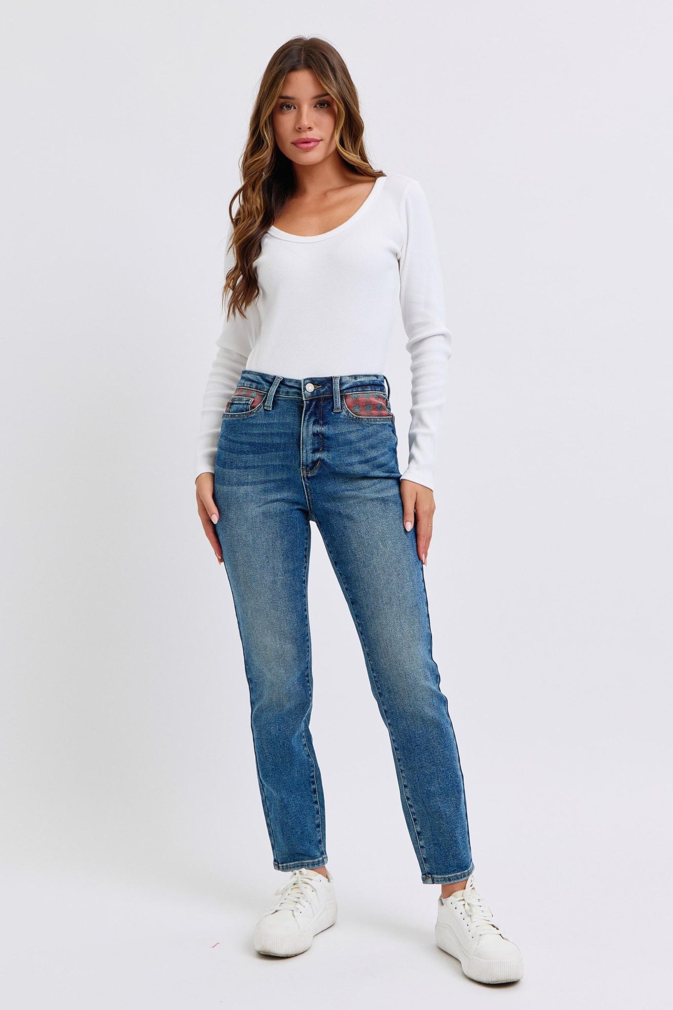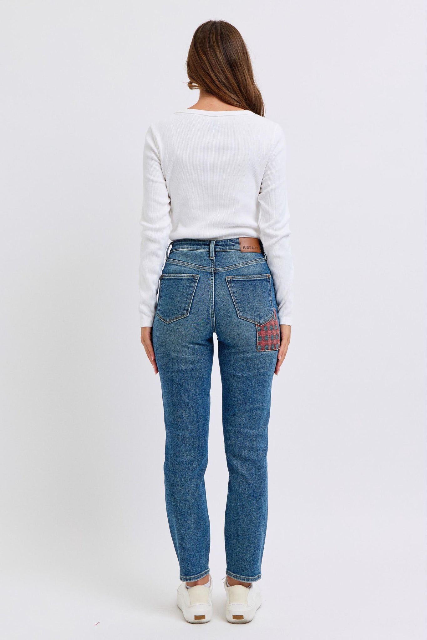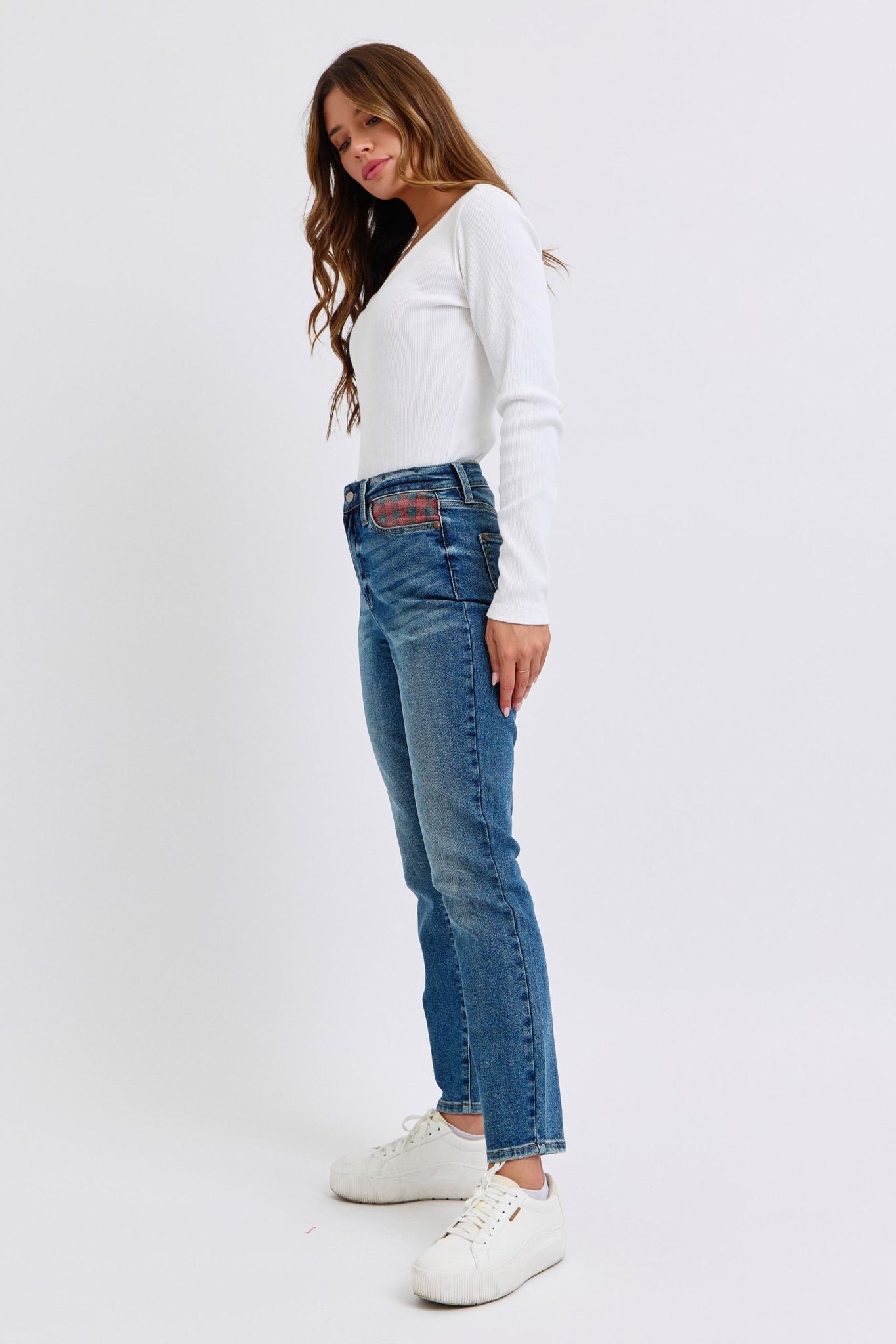 JUDY BLUE HIGH WAIST PLAID PATCH SLIM JEAN - MEDIUM STONE
