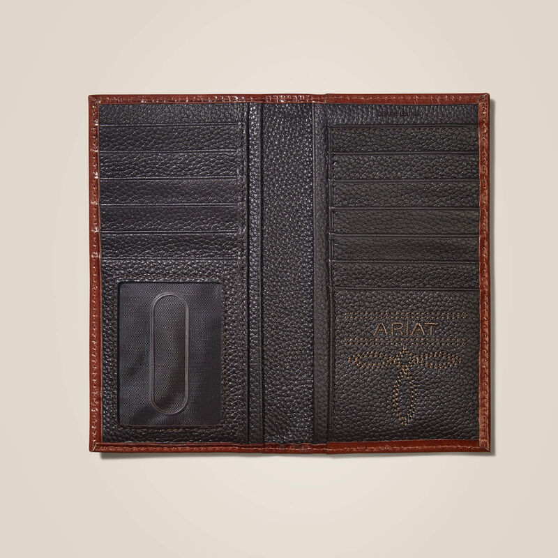 This Ariat leather rodeo wallet by M&F Western Products features an oak embossed design, Ariat brand concho, and alligator print top. Inside features a clear ID slot, credit card slots, removable photo slip, and money slots.