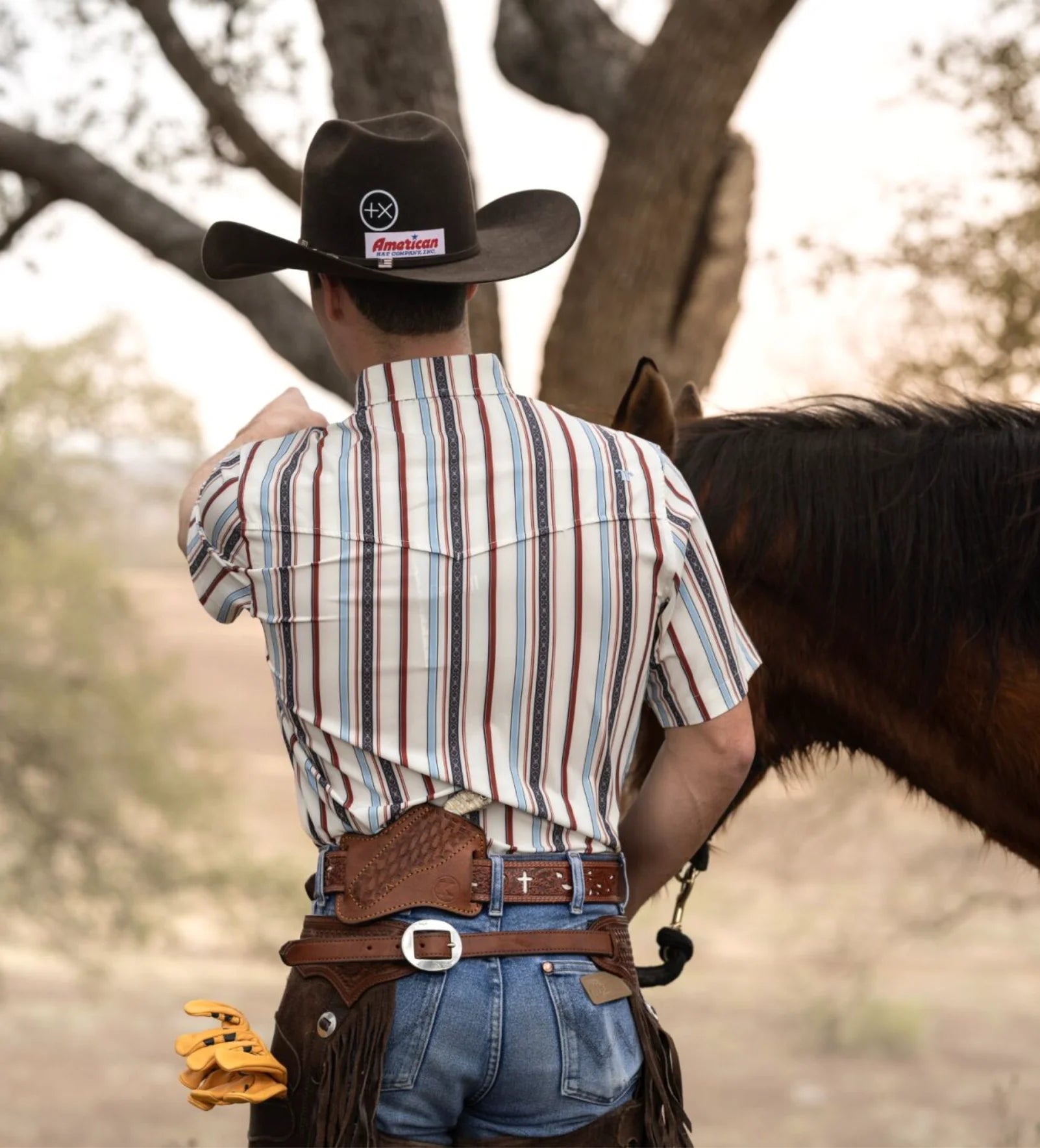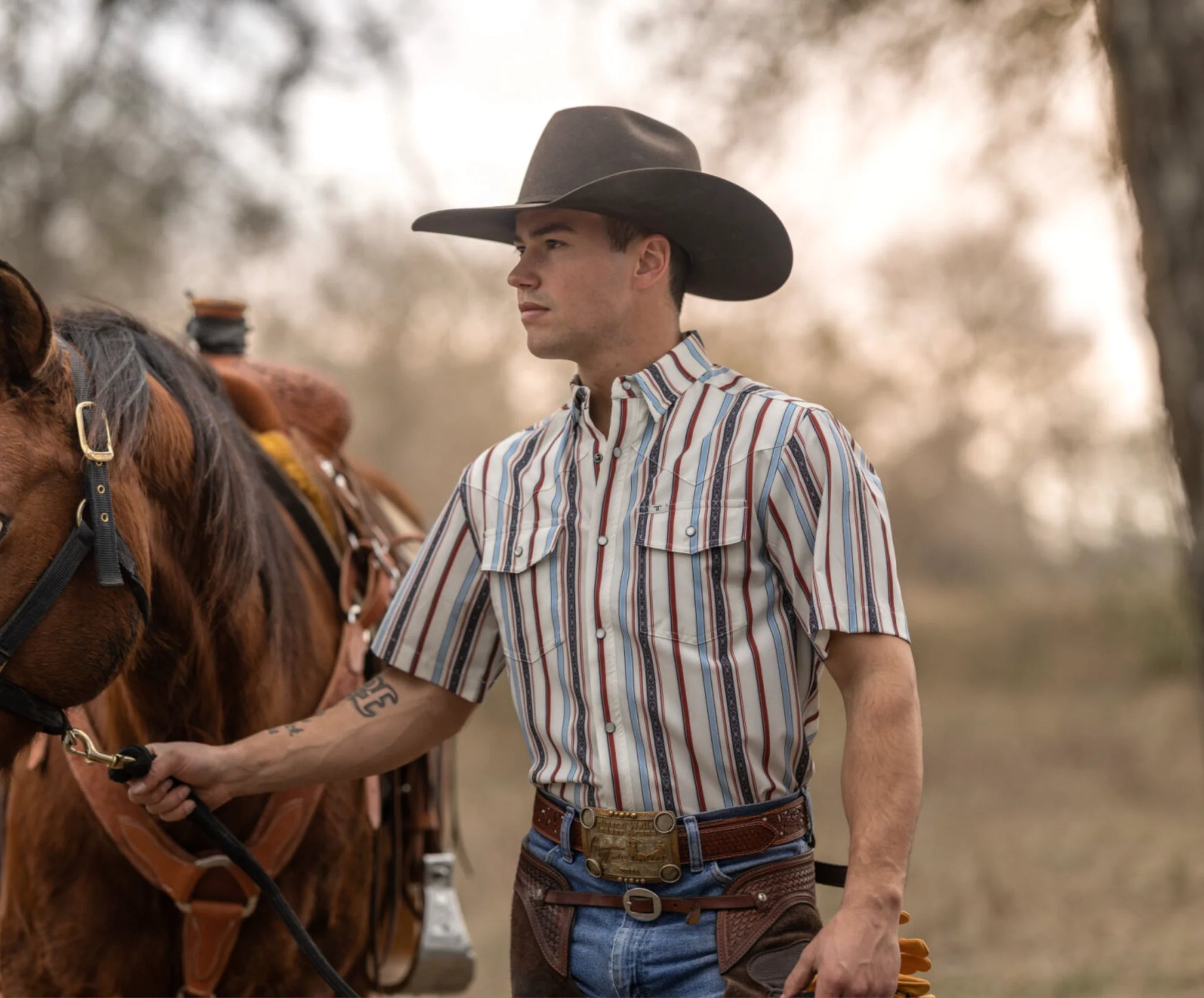 A crisp white base with bold multicolor striping, finished in a short-sleeve snap that feels easy and effortless. Lightweight, breathable, and built with soft stretch, it’s a standout option for hot days when you still want a clean western edge.