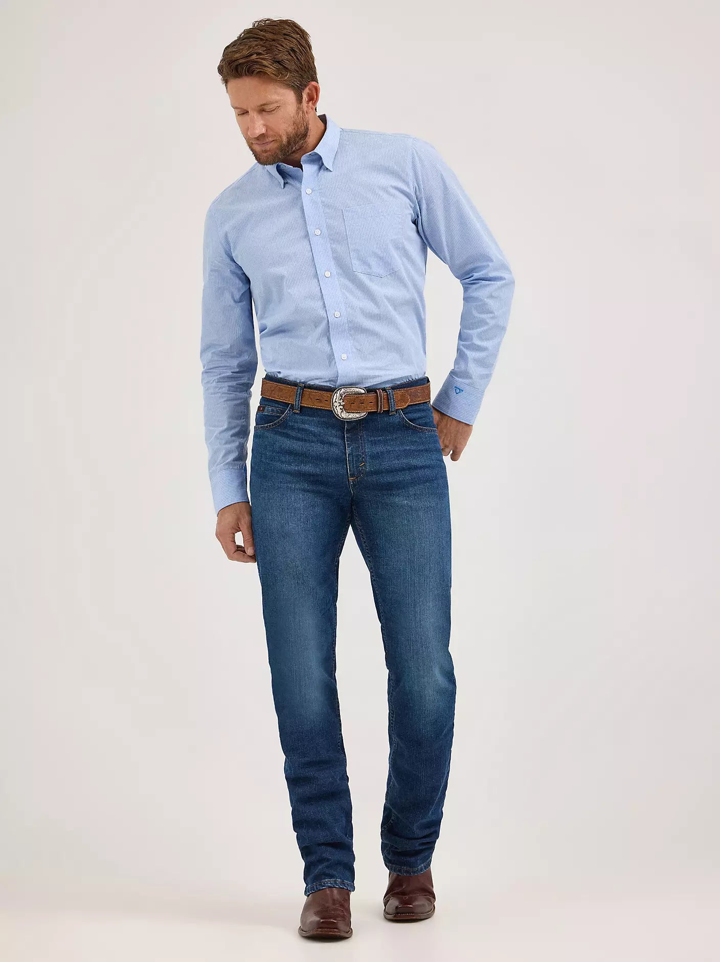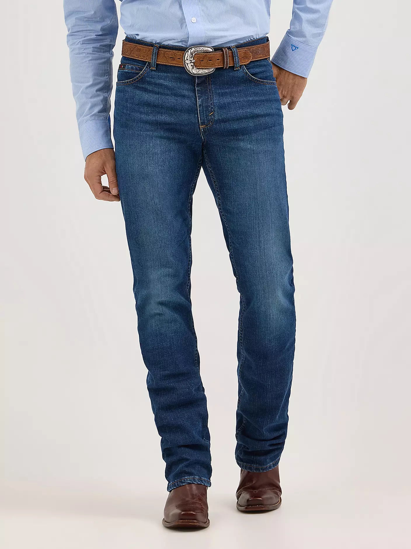 Make your next move a bold one in the Men's Cody Johnson 20X® Advanced Comfort 02 Competition Regular Fit Jean. With a narrower fit through the seat and thigh, these jeans sit just below the waist and come with a straight leg opening that still fits perfectly over cowboy boots. Its midweight denim is made of cotton with just the right amount of stretch to keep you moving in total comfort. Don’t worry—these jeans come with the signature five-pocket styling, ‘W’ stitching, and a Wrangler® patch. Plus, they're finished with COJO’s own logo for a stamp of authenticity.