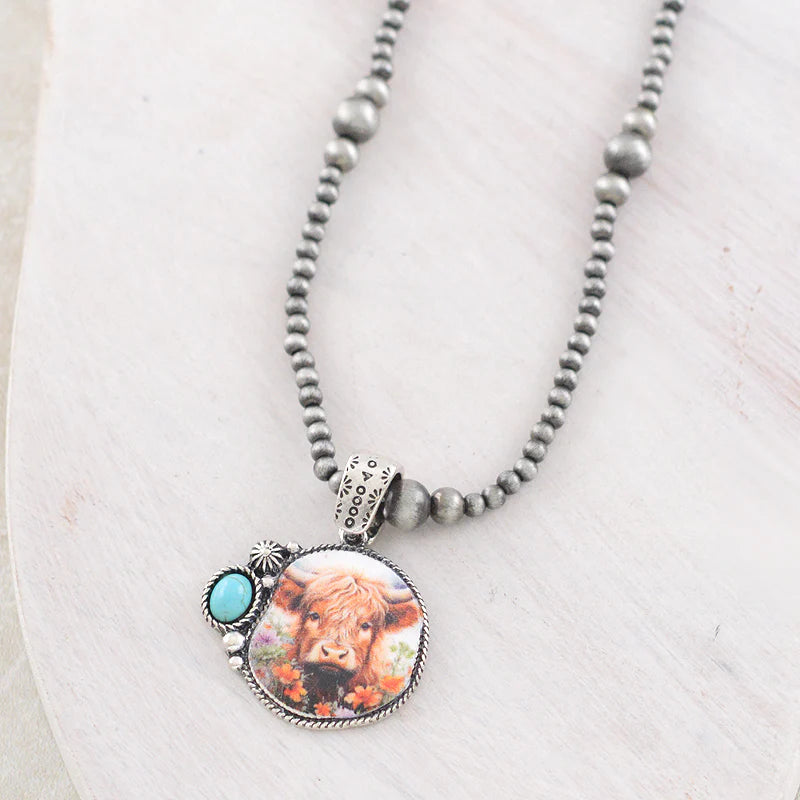 HIGHLAND COW PENDANT NAVAJO PEARL BEAD NECKLACE