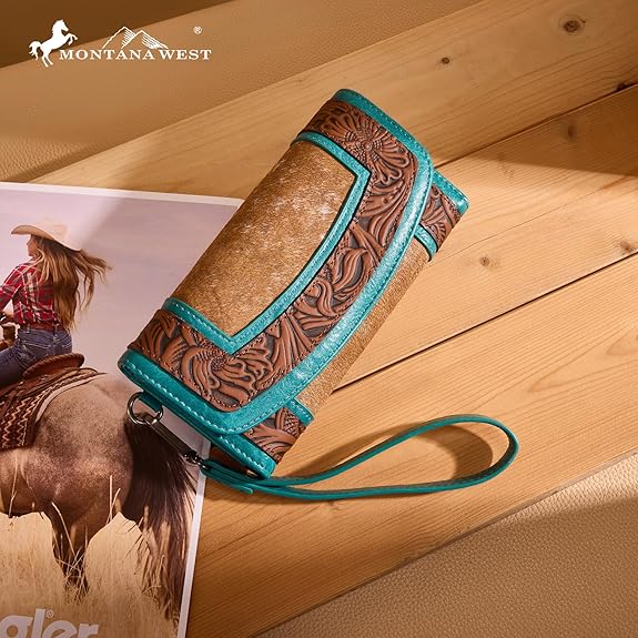 Montana West Hair-On Hide Tooled Wallet – Western Wristlet - Brown Turquoise