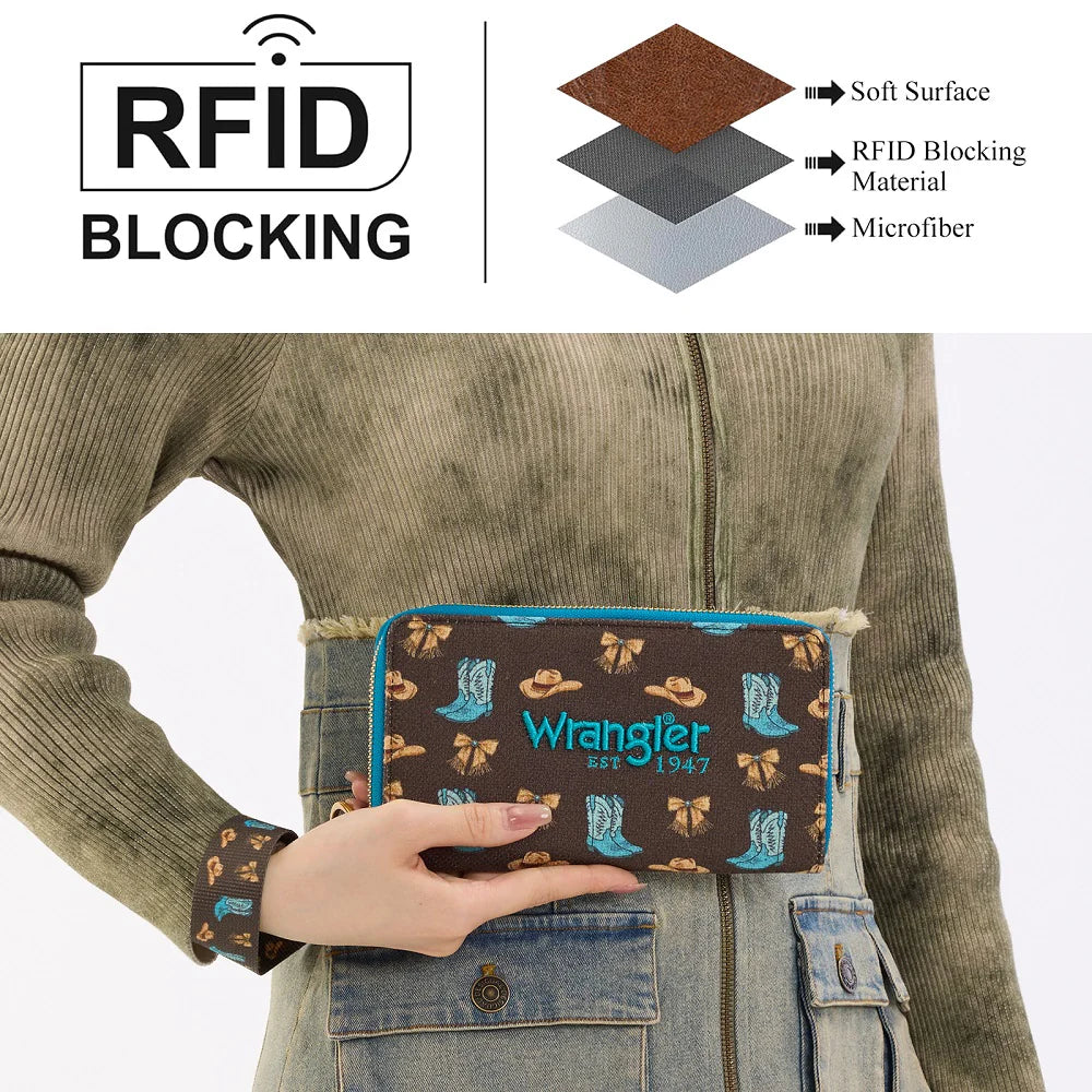 Wrangler Western Print RFID Blocking Zippered Cowgirl Wallet - Coffee