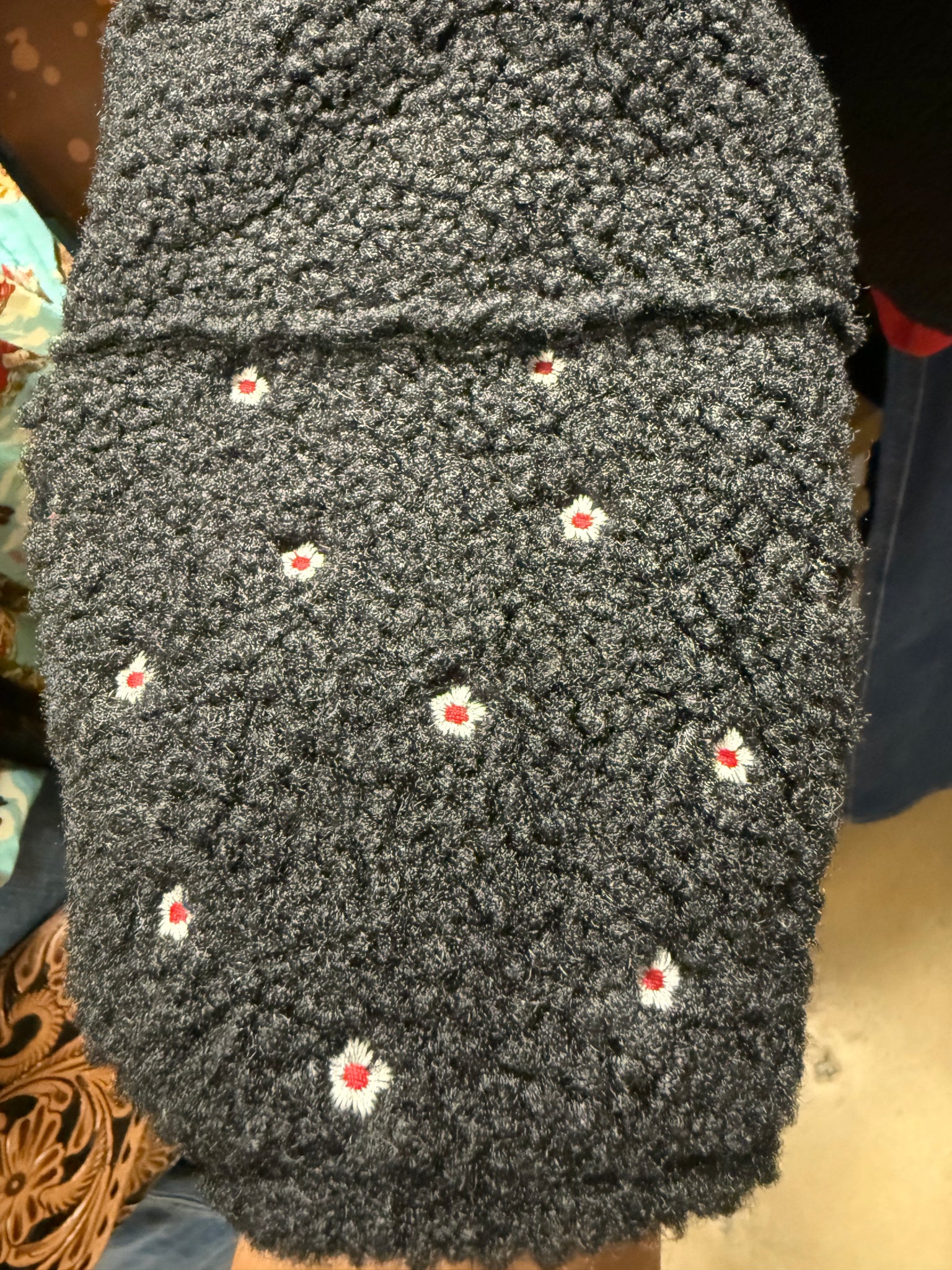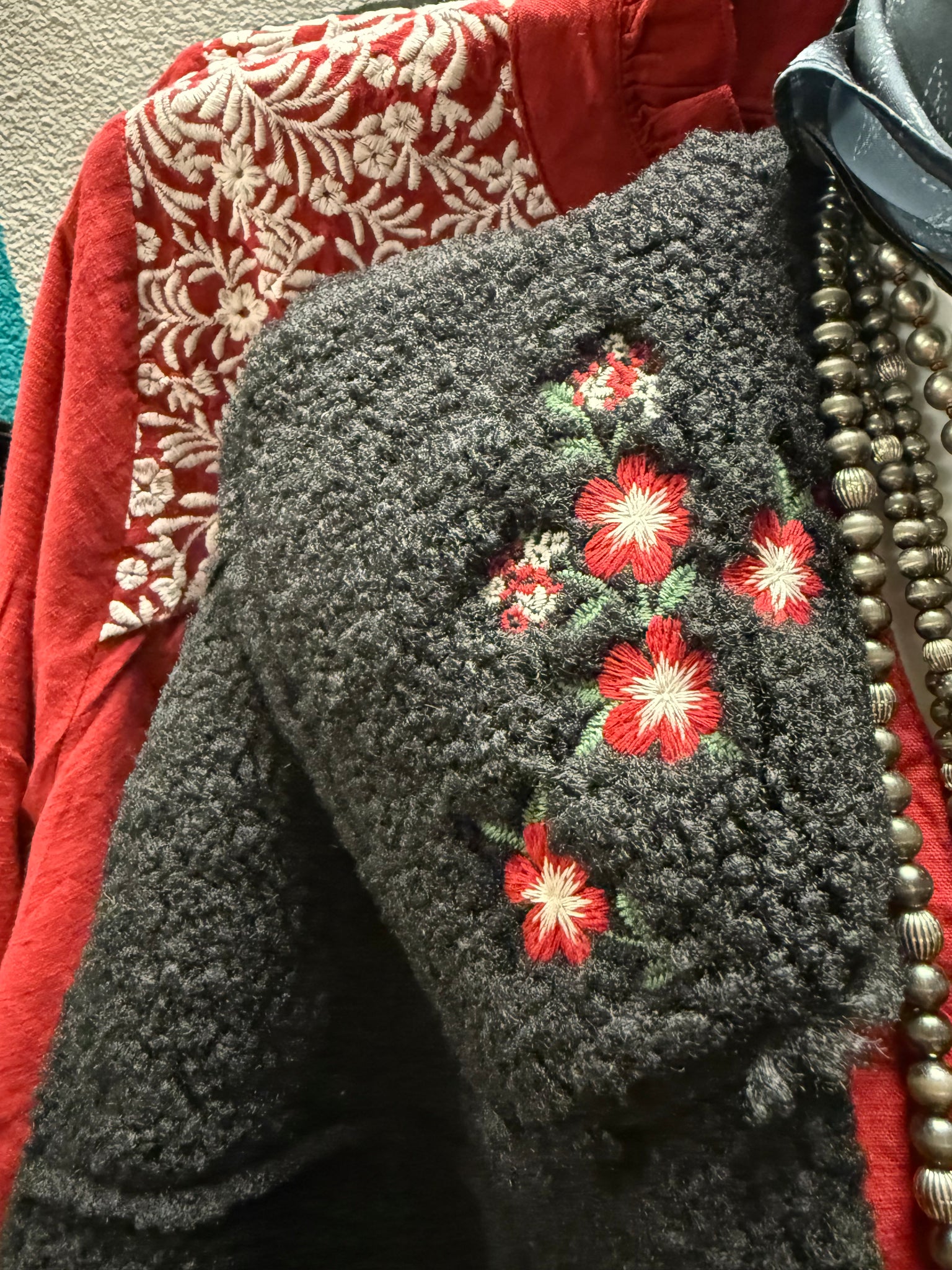 Savanna Jane Black Sherpa Button Down Jacket. Floral Embroidery on the Collar and Sleeves.