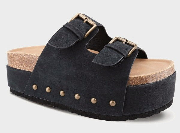Cover all your style bases in the Babes Everyday women's sandal. Featuring a faux suede upper with large buckled straps for extra flair, this studded platform sandal is anything, but subtle. The lined footbed cradles your foot, while the covered platform adds style and just enough lift.