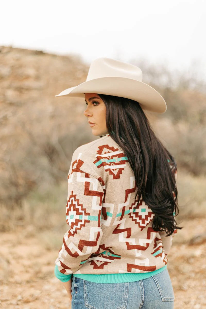 Stay trendy and cozy in our Follow Me Knit Sweater! This tan sweater features playful pops of turquoise and a unique Aztec design. Perfect for any casual occasion, this sweater will keep you stylish and warm all season long!