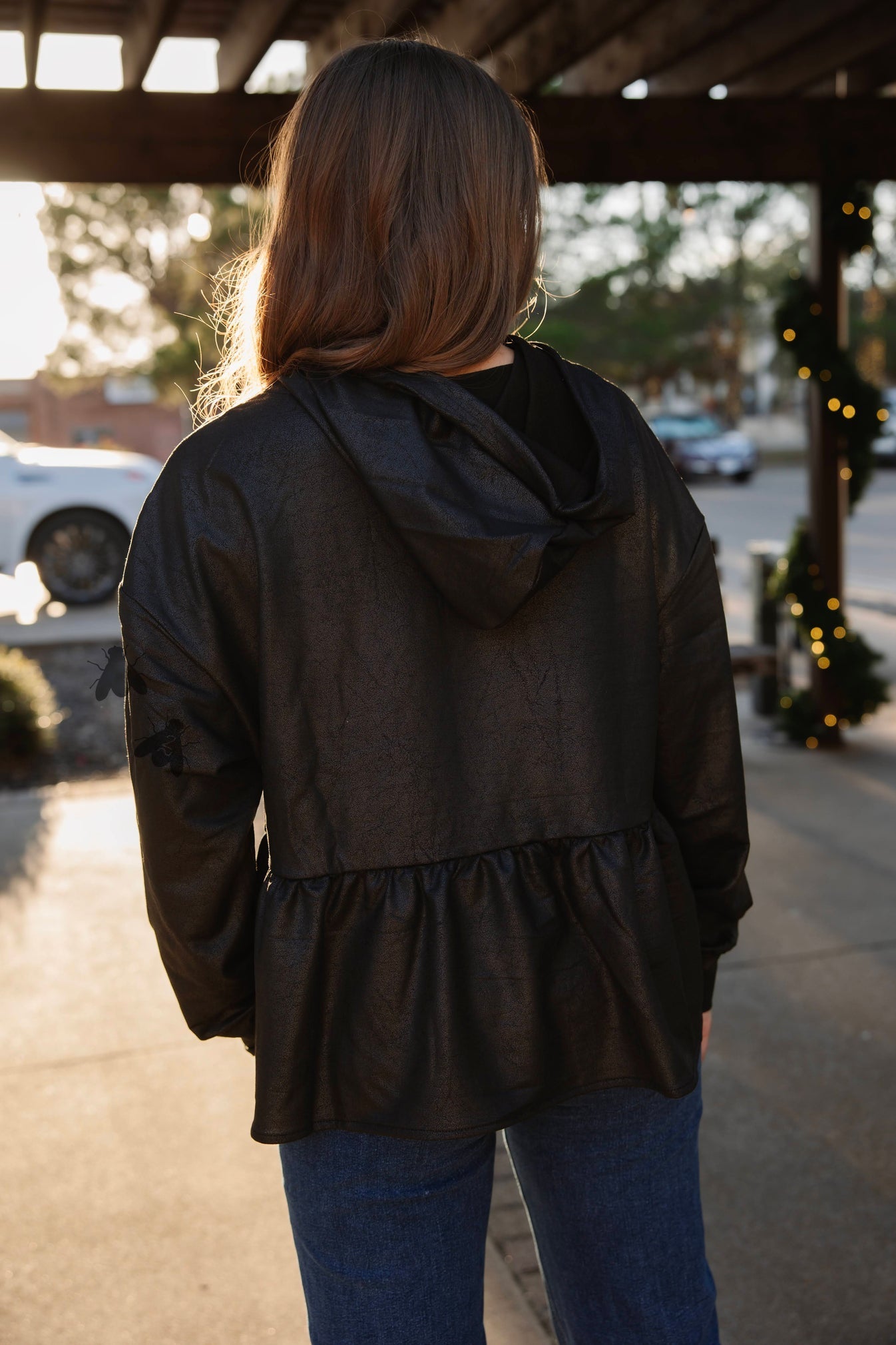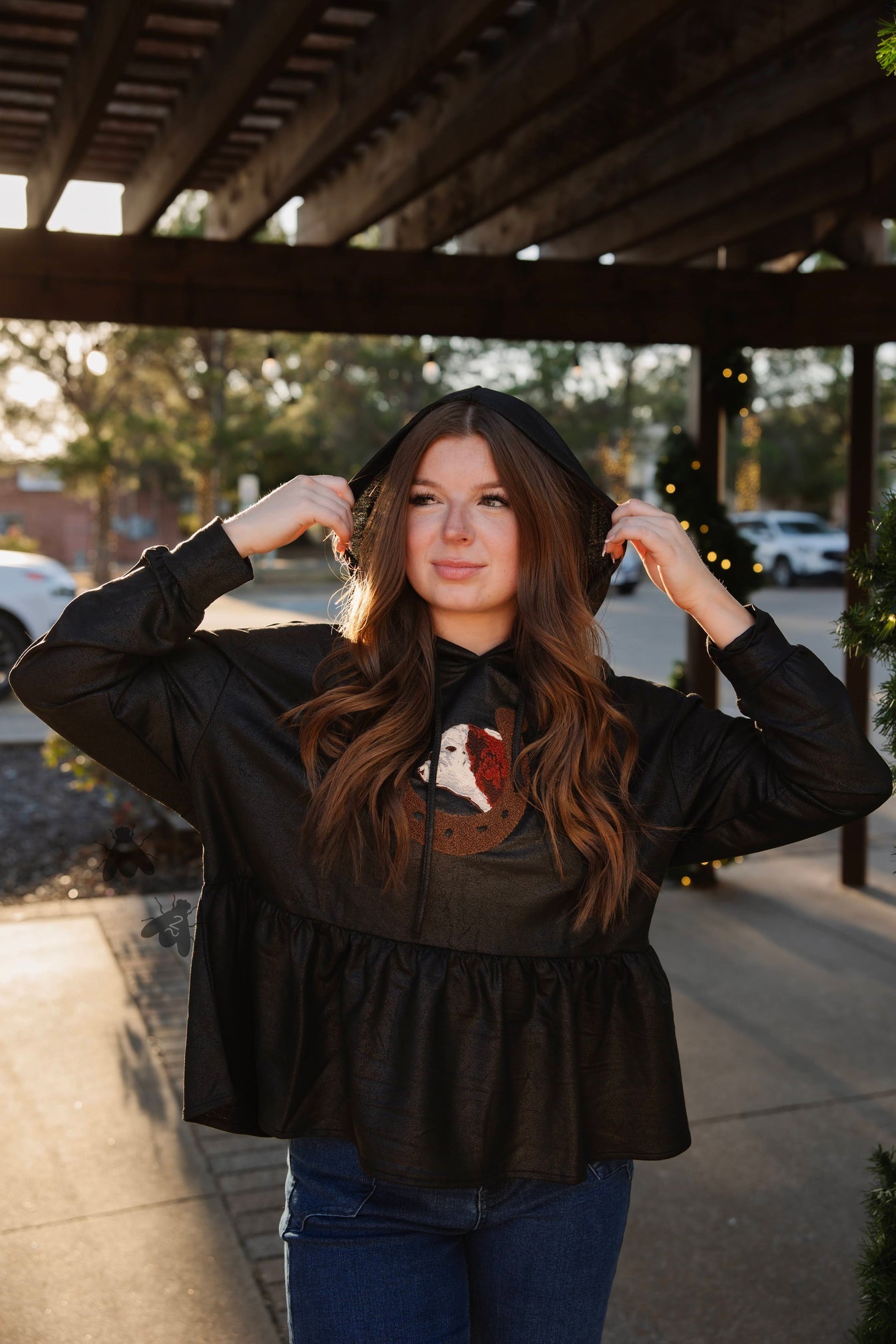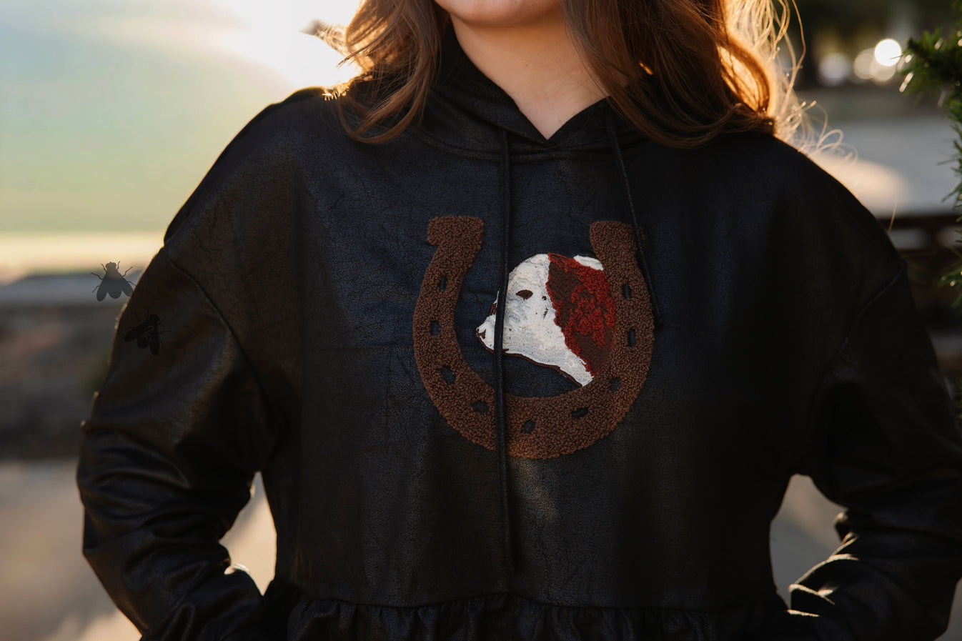 we took the same vibe as loopty lou but applied to a hoodie... and it did not disappoint. it's a leather lux hoodie with hereford. IF you haven't met our leather lux -- it's a leather effect material that has stretch. style it with some denim and you're good to go!