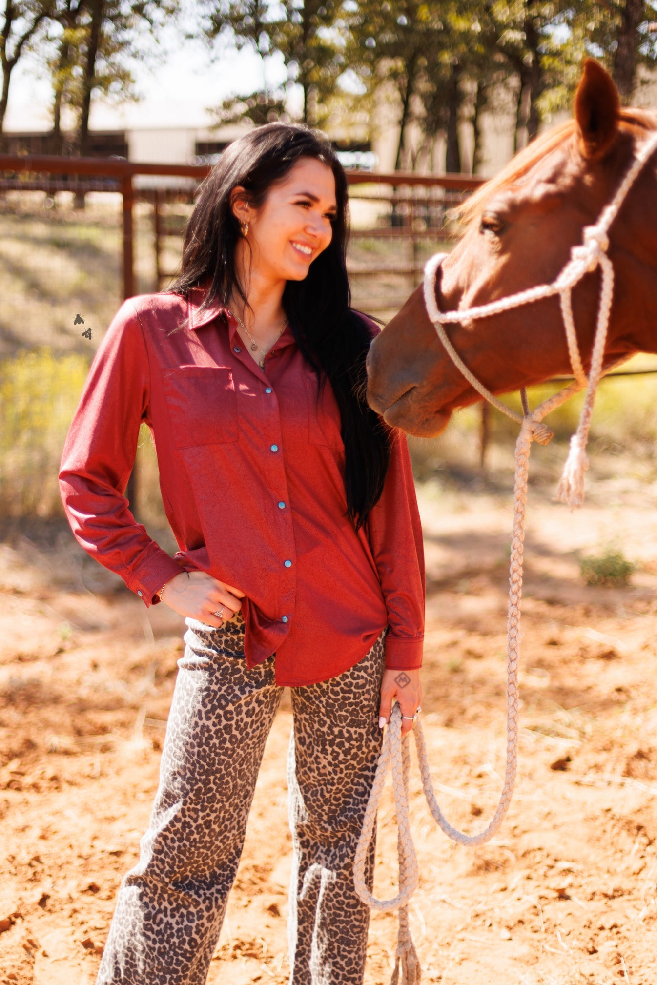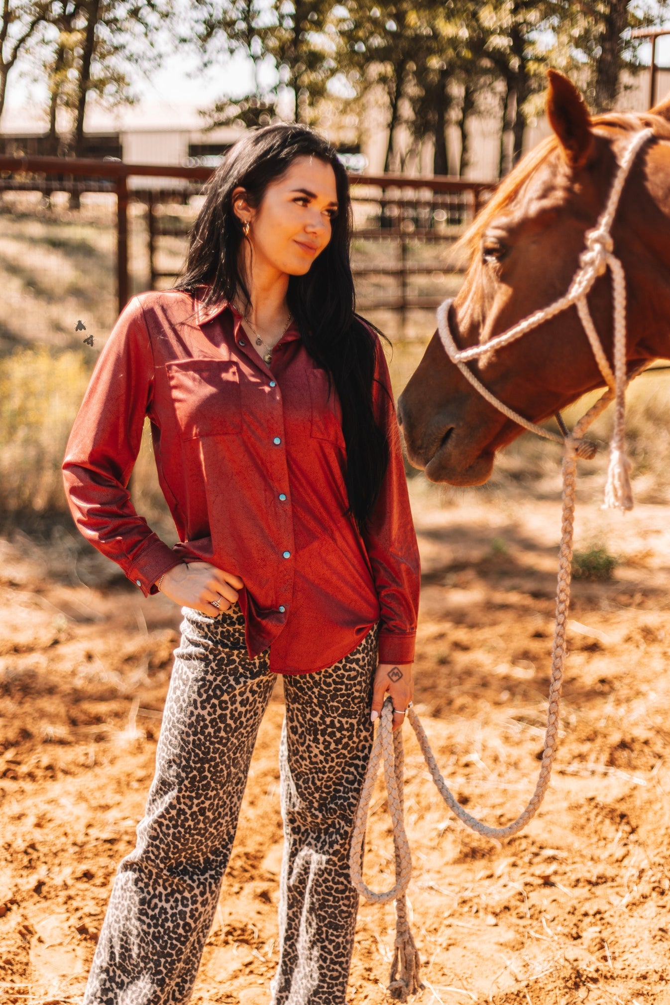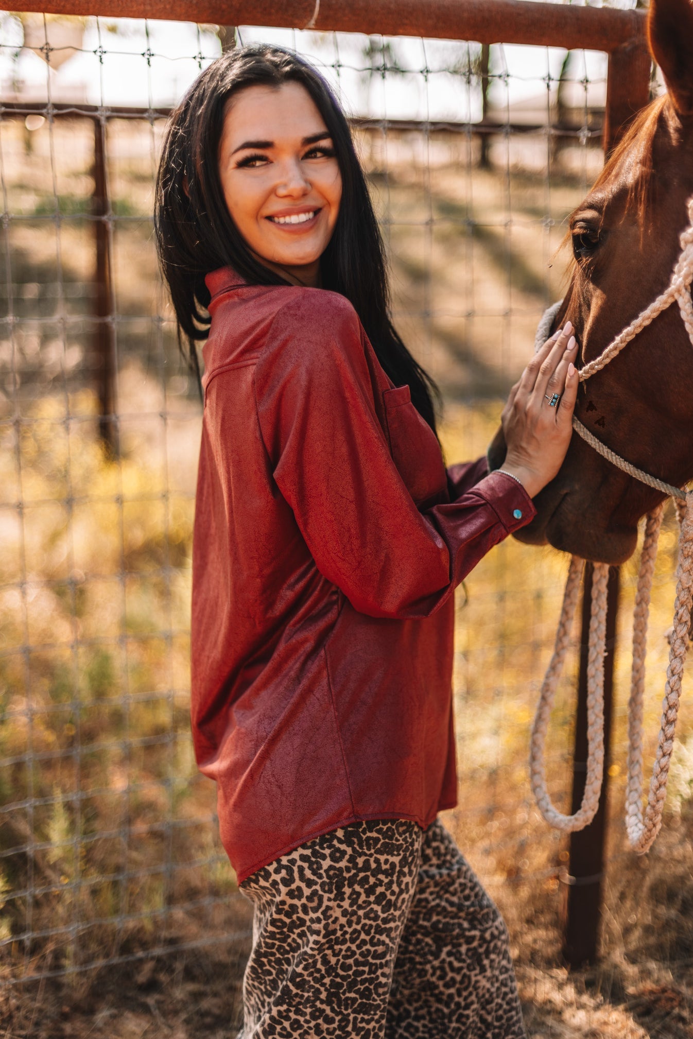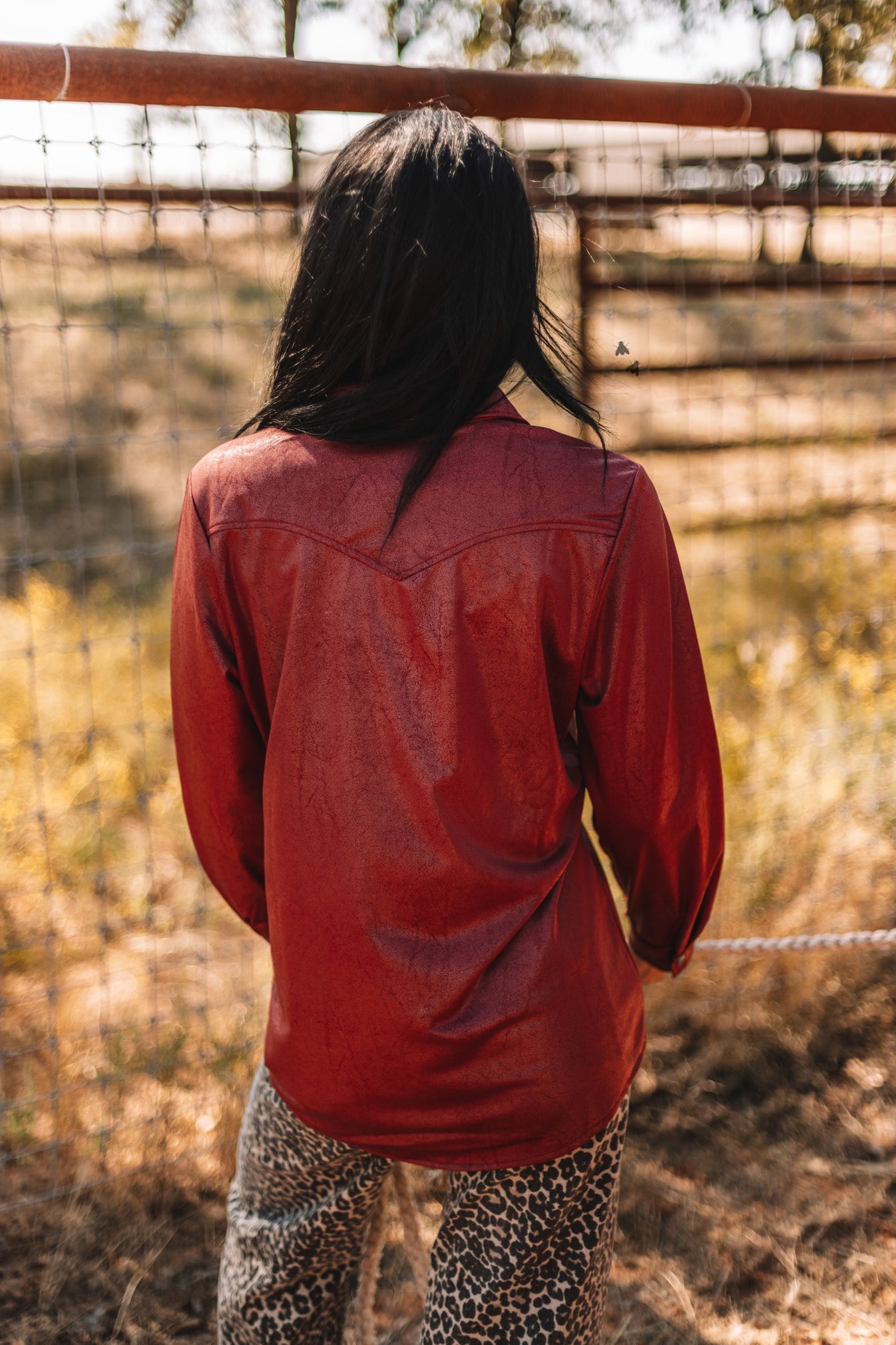 we cut your velvet last year.THIS YEAR we give you LUX LEATHERa button down that will PAIR so many ways.with those TURQ PEARL SNAPS for the ultimate detail touch.you are going to want MORE COLORS... TRUE to WOMENS SIZE.