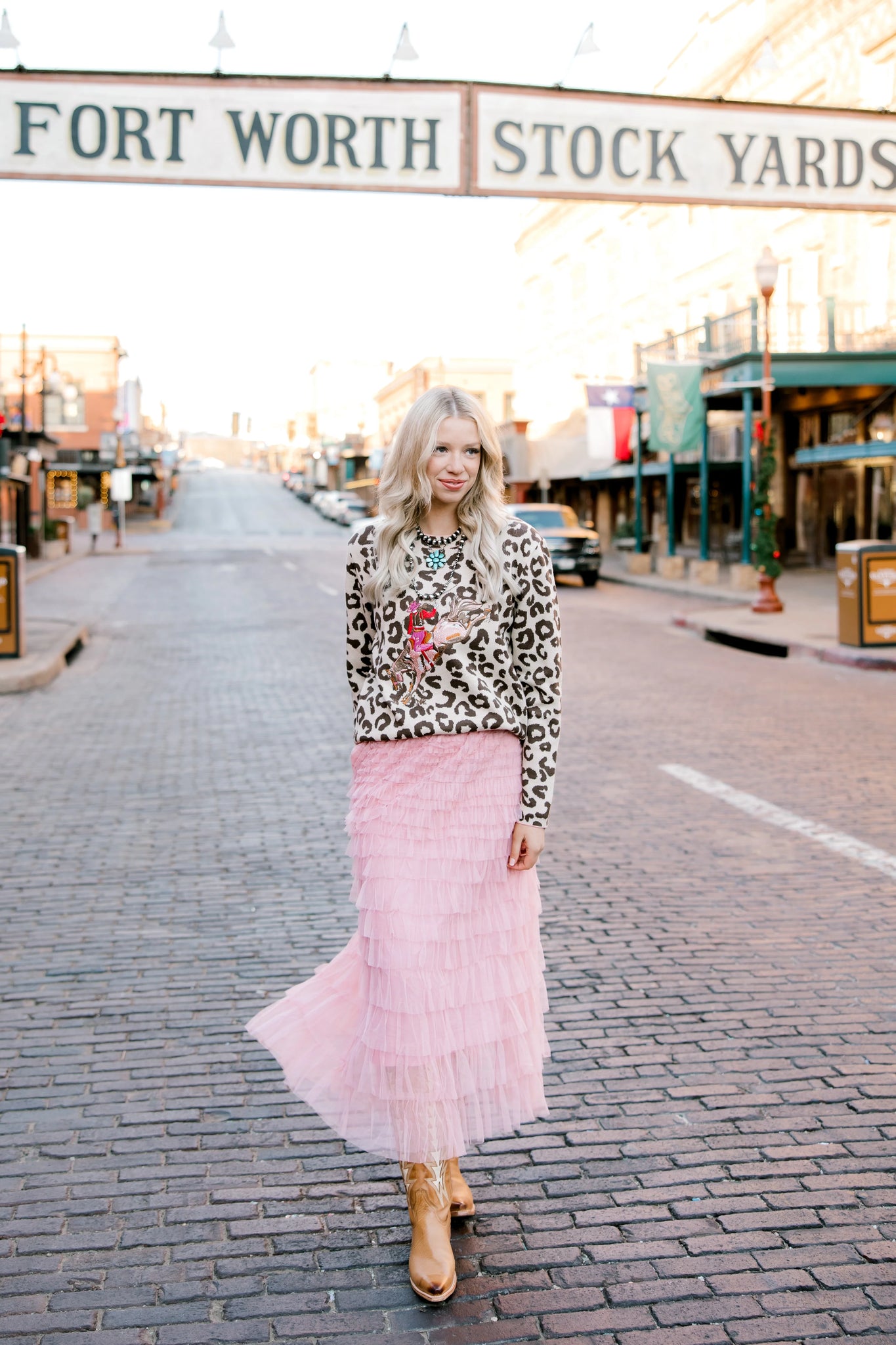 This leopard sweater is serving wild western vibes with a buckin’ horse embroidered front and center. Cozy with just the right amount of sass, it’s made for standing out while staying comfy. Pair it with a tool skirt and boots for a girly look, or tone it down with classic blue jeans and a trucker hat for effortless cool cowgirl.