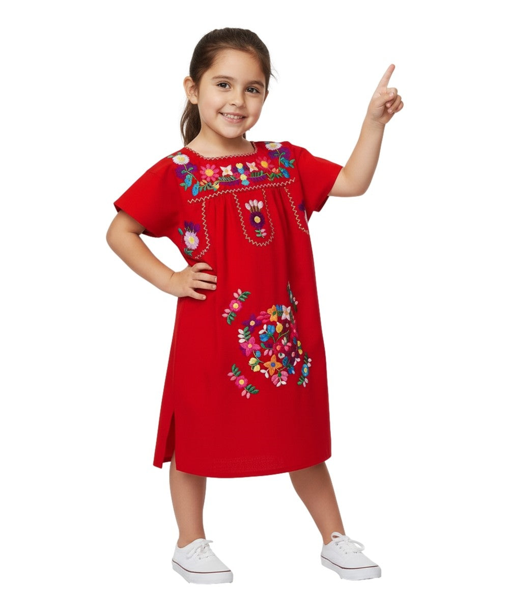 KIDS ROUND NECKLINE FLORAL EMBROIDERY DRESS - RED