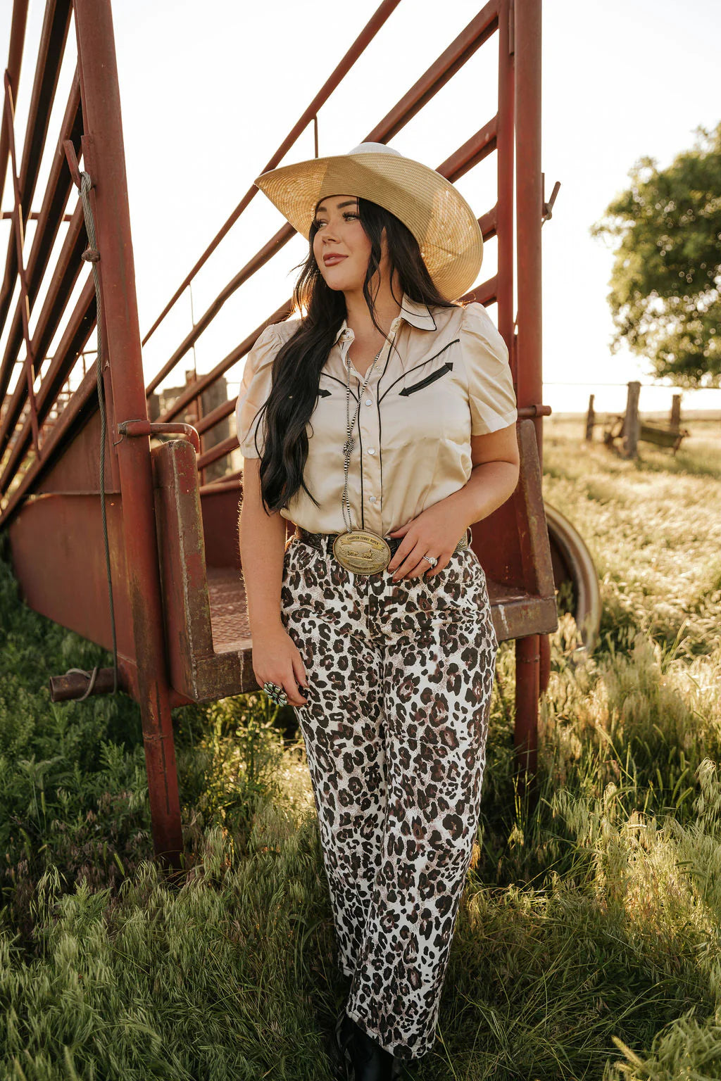 Show your Western vibes wearing this awesome ivory colored satin shirt with vintage "smile" arrows. Perfect for days when you need to look good and feel comfortable, reach for a high-shine satin fabric and a little flair!