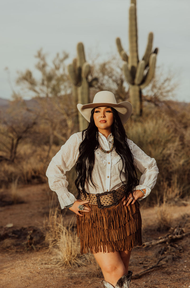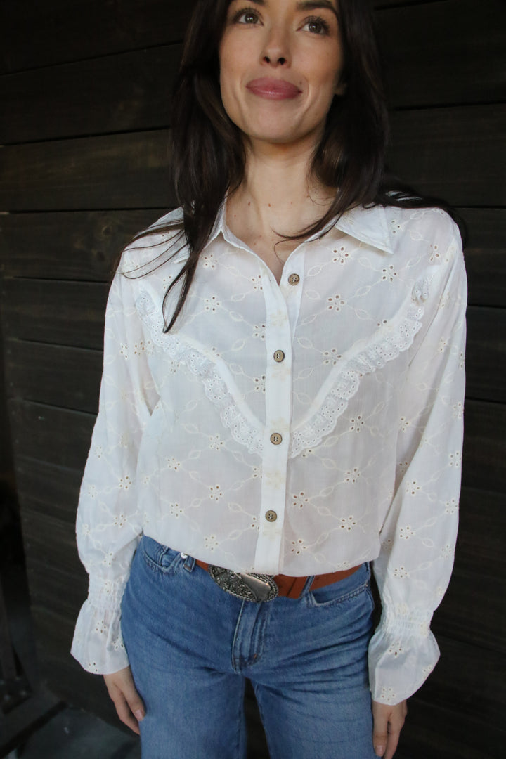 IVORY EYELET BUTTON UP BLOUSE WITH RUFFLE ACCENTS