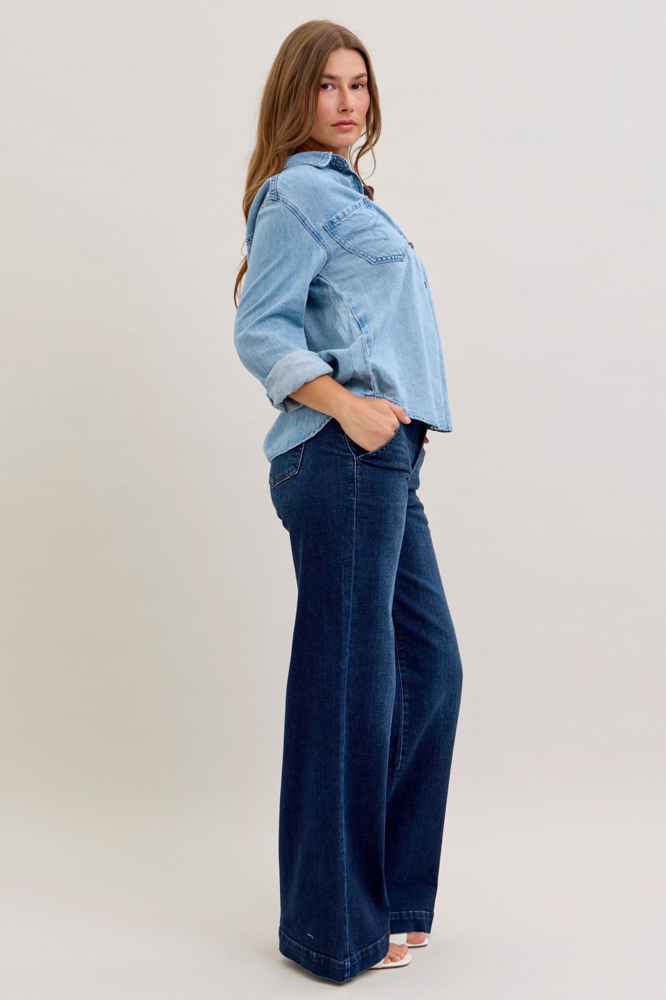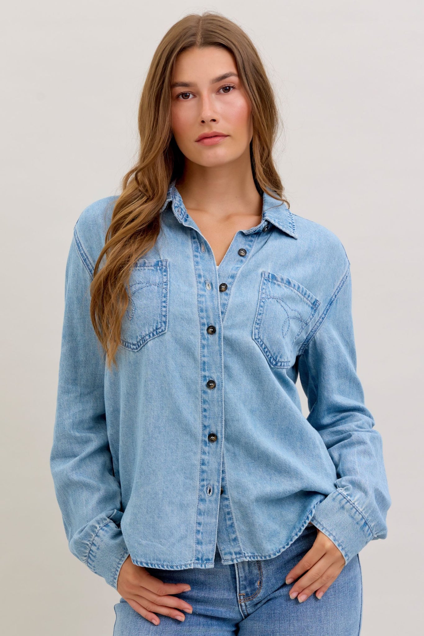 JUDY BLUE DENIM LONG SLEEVE BUTTON UP TOP