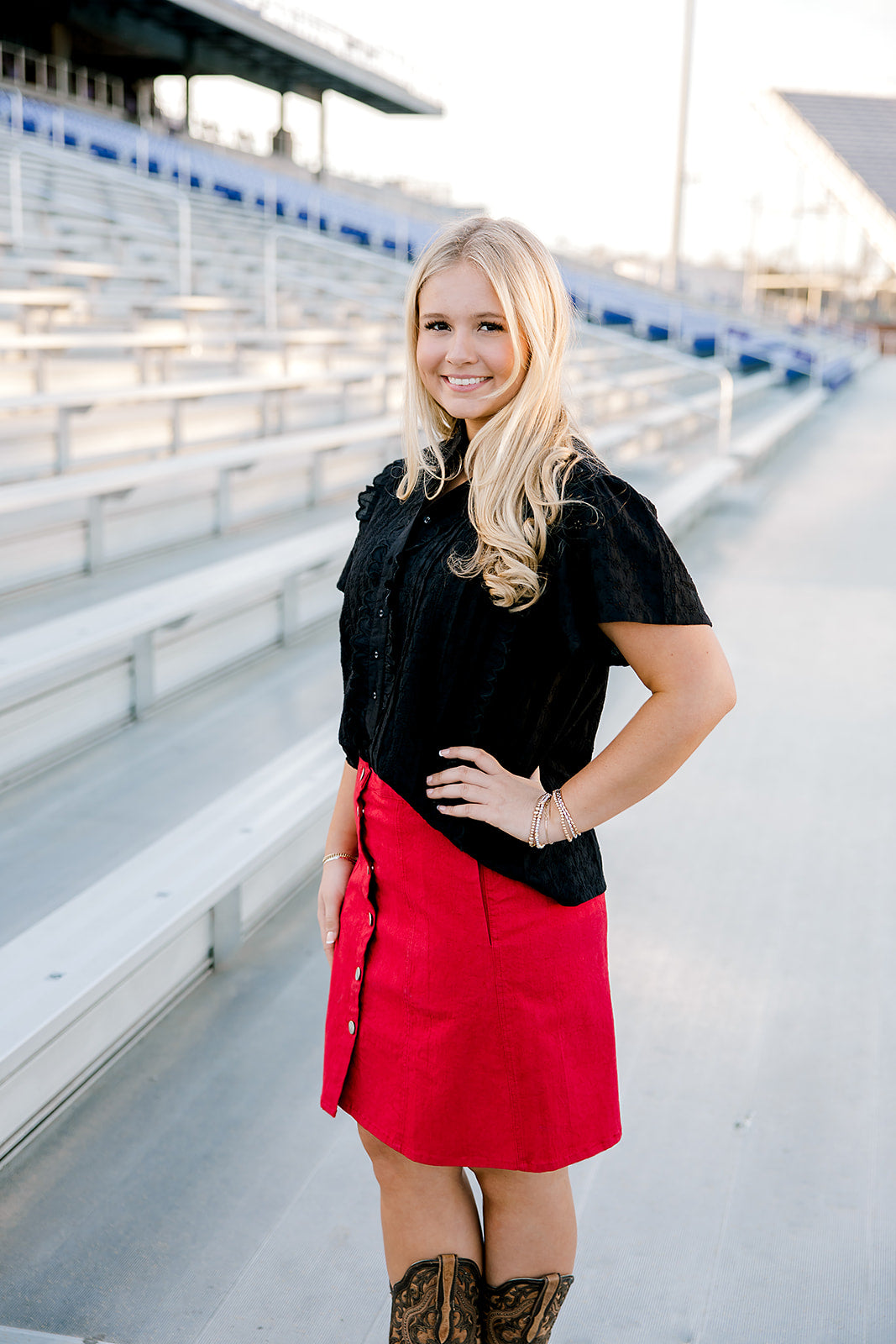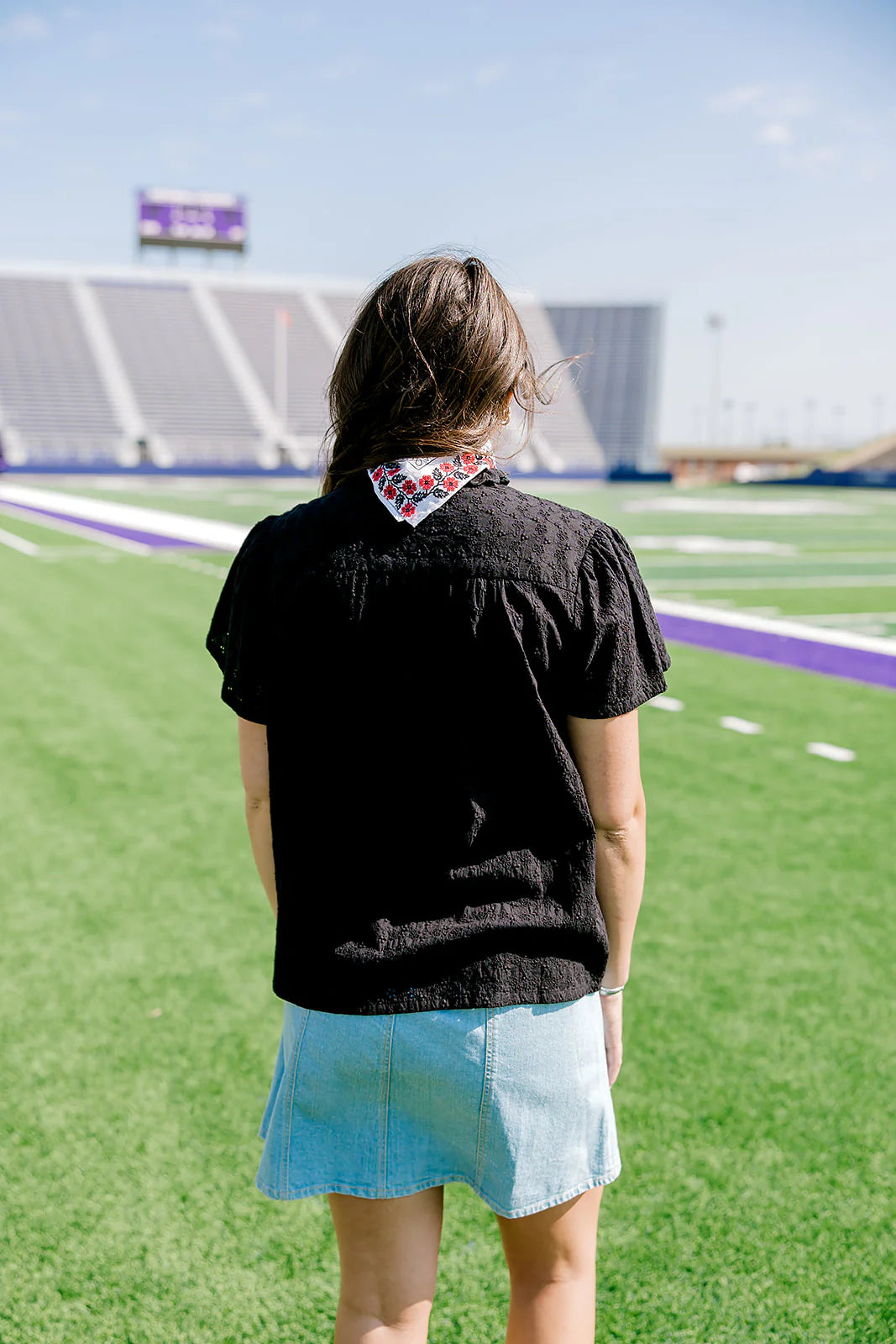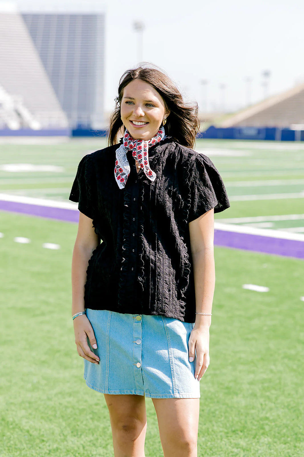 Bring the heat and show your spirit in a top that screams confidence and pride. This game day edition features a textured short-sleeve design with ruffle details, a flattering v-neckline, and a rich black color that is perfect for cheering in style from the tailgate to the stands.