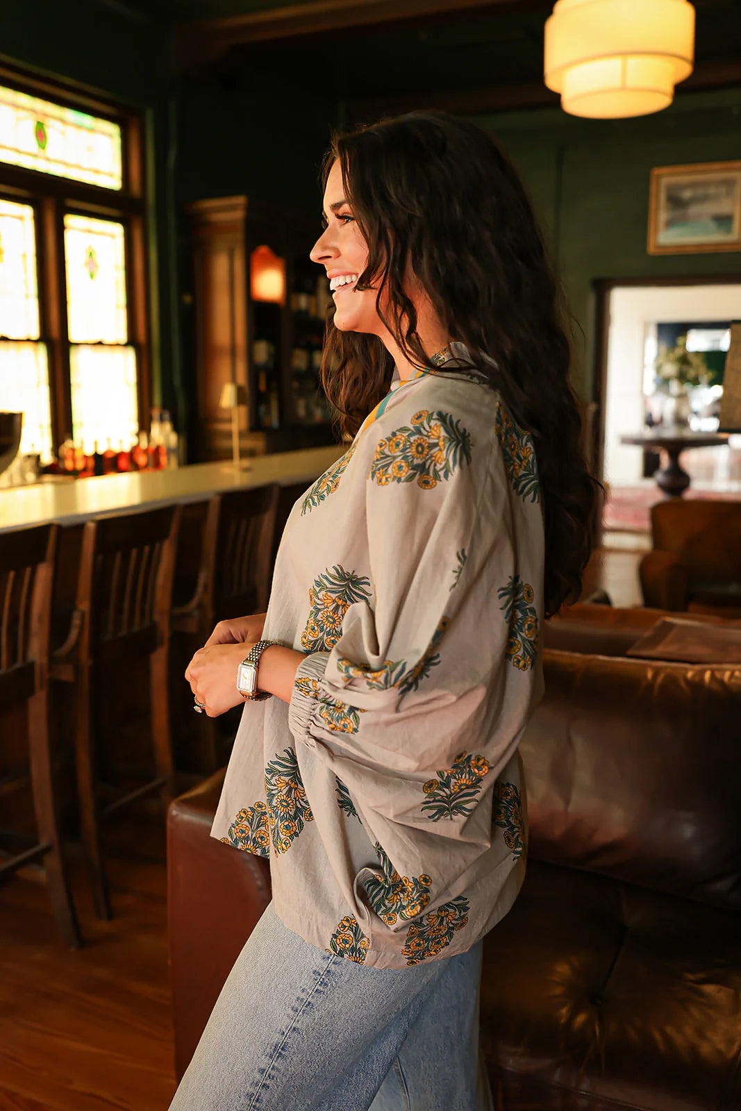 Fun and fall inspired all in one! Pair with denim for the perfect outfit! The Tori Top showcases a fun poncho style top with floral yellow and blue graphics.