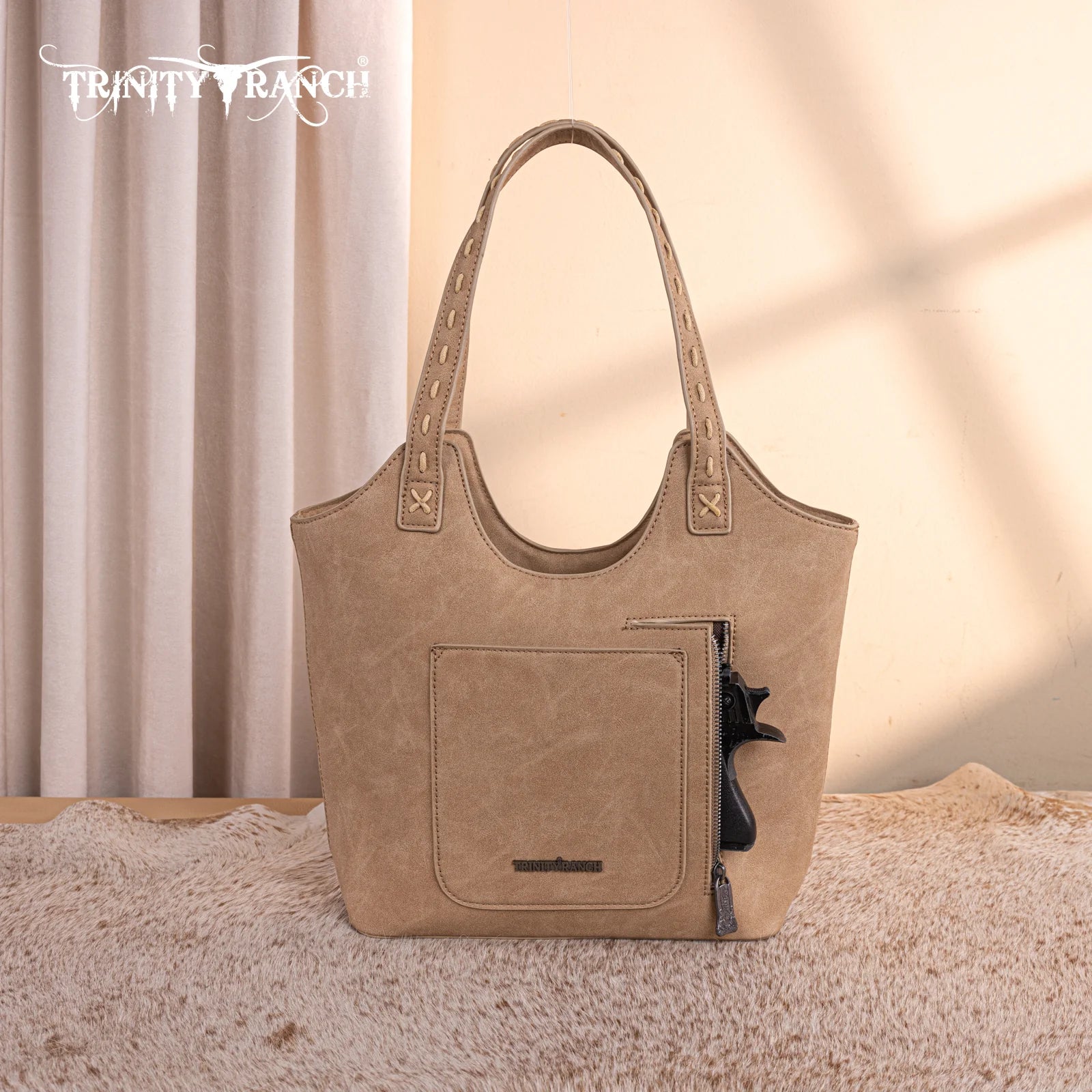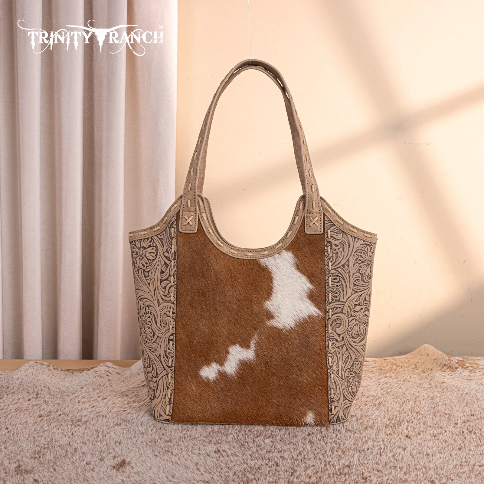 Trinity Ranch Genuine Hair-On Cowhide Tooled Concealed Carry Tote - Tan