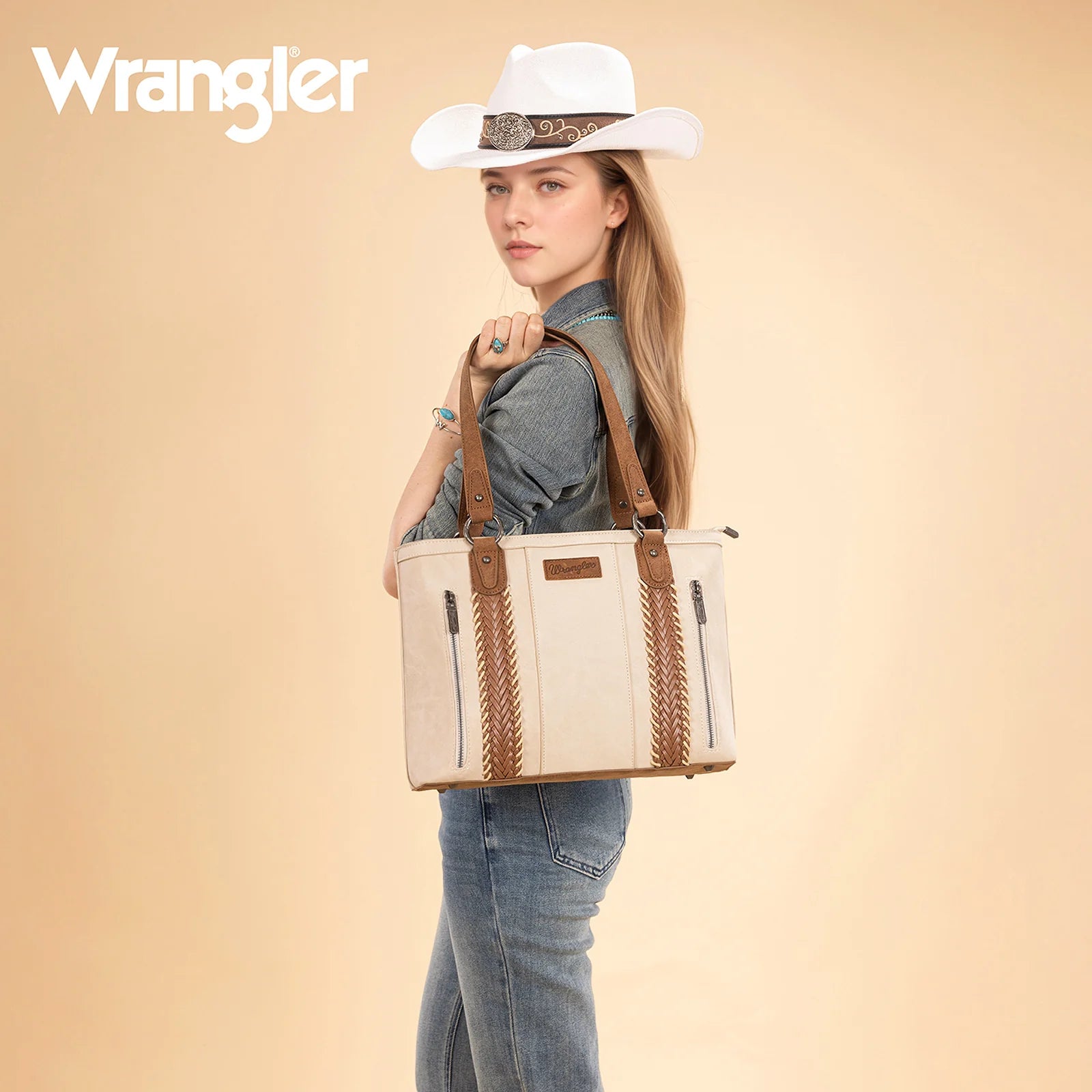 Timeless western charm with everyday versatility. This Wrangler tote features eye-catching braided panels with whipstitch accents that add texture and rustic appeal.