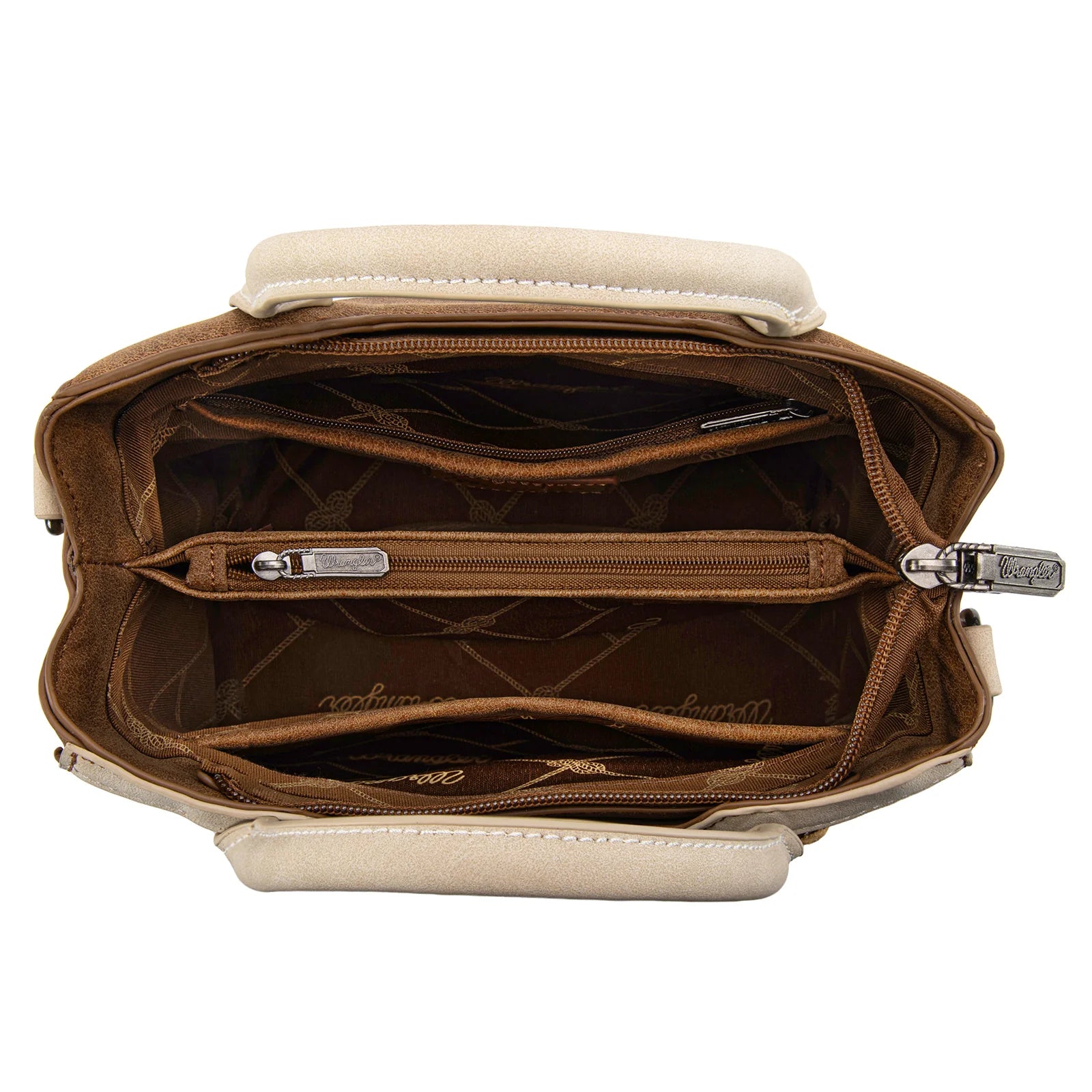 Timeless western charm with everyday versatility. This Wrangler top handle crossbody features eye-catching braided panels with whipstitch accents that add texture and rustic appeal.