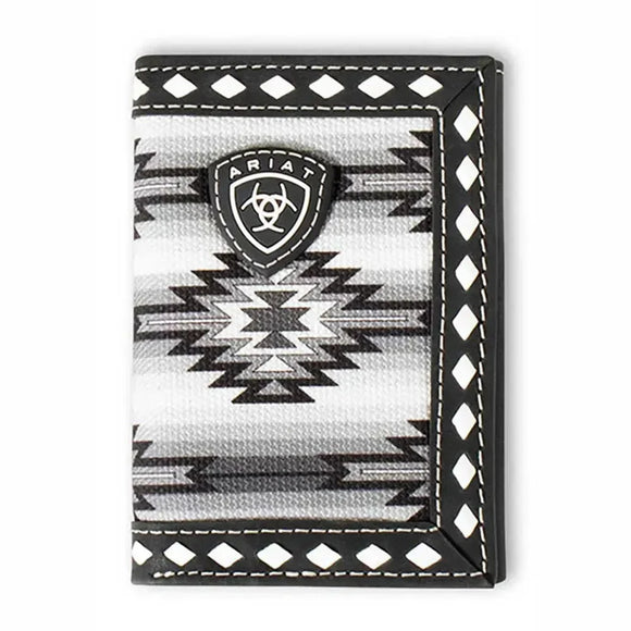 Ariat trifold wallet by M&F Western Products. This great wallet has a black, white and grey southwest cotton fabric on the front along with a rubber Ariat patch. White diamond lacing trim around the edges. Multiple card slots along with a cash slot and ID window.